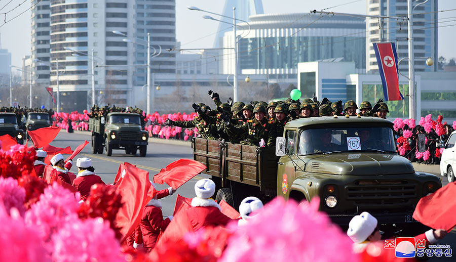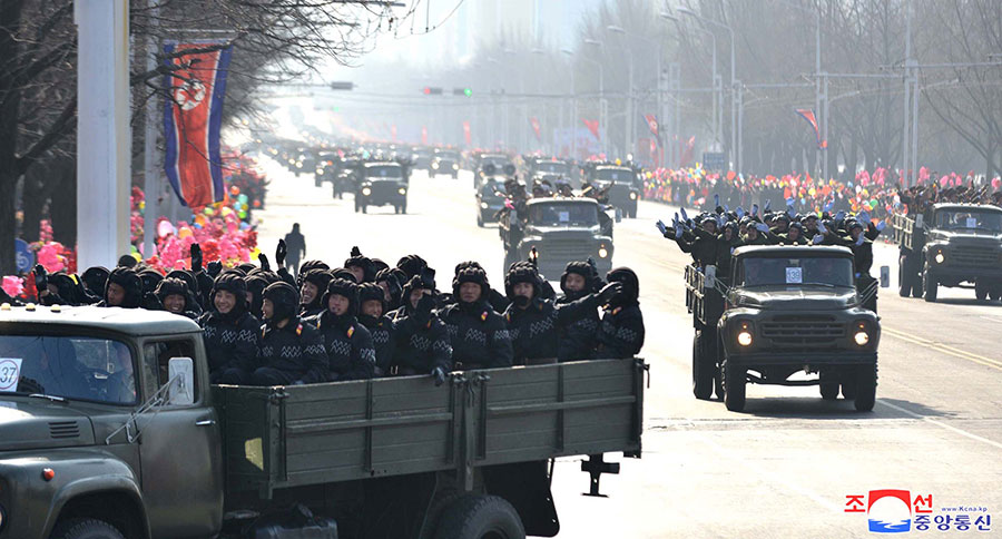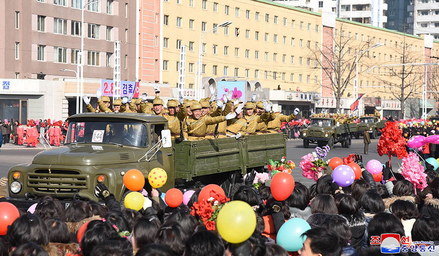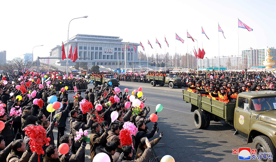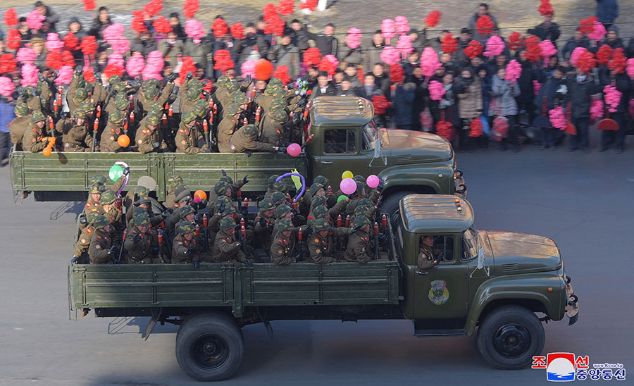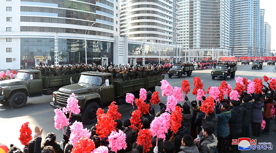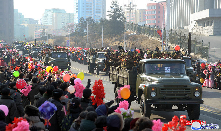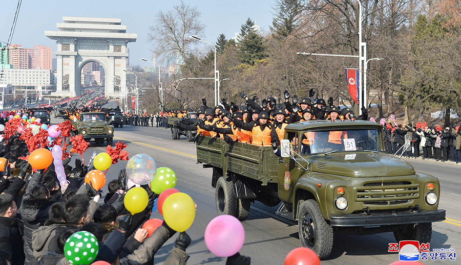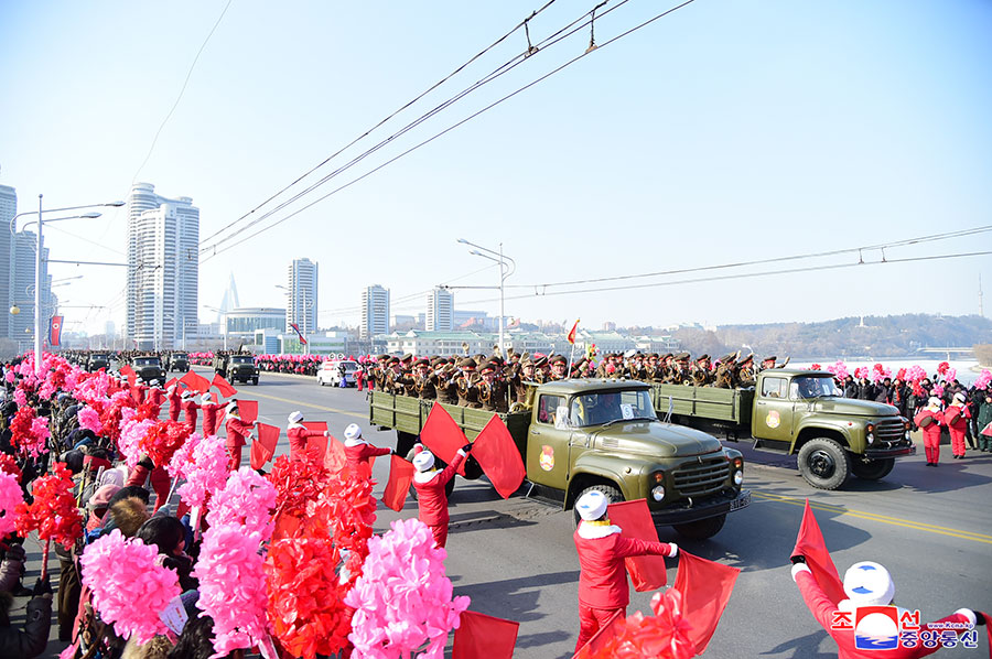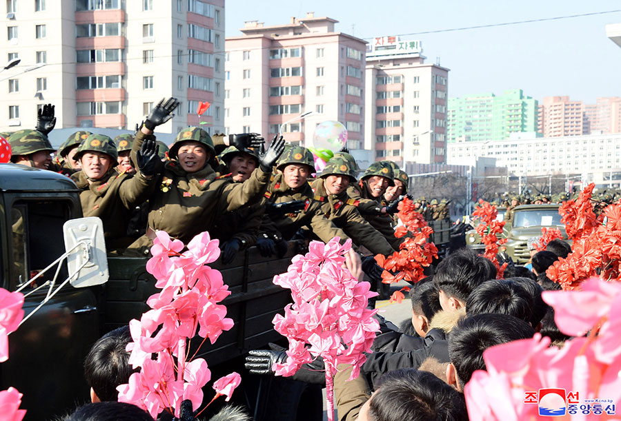 Pchjongjang, 9. února čučche 107 (2018) (KCNA) – Sloužící mužstvo, které se zúčastnilo velké vojenské přehlídky, která se konala za přítomnosti váženého nejvyššího vůdce soudruha Kim Čong Una k 70. výročí založení Korejské lidové armády, bylo ve čtvrtek uvítáno obyvateli Pchjongjangu v ulicích hlavního města.