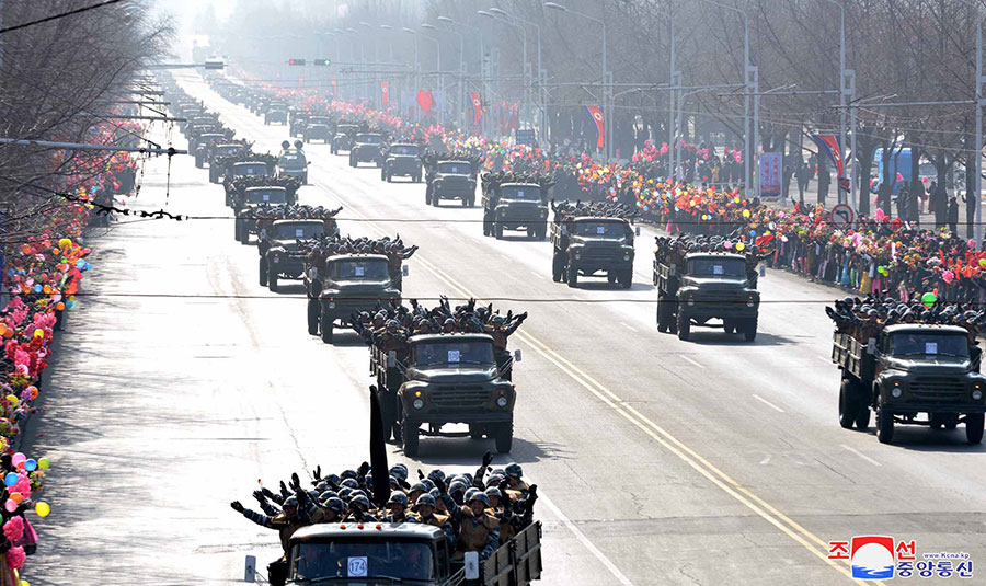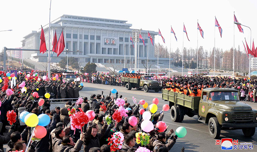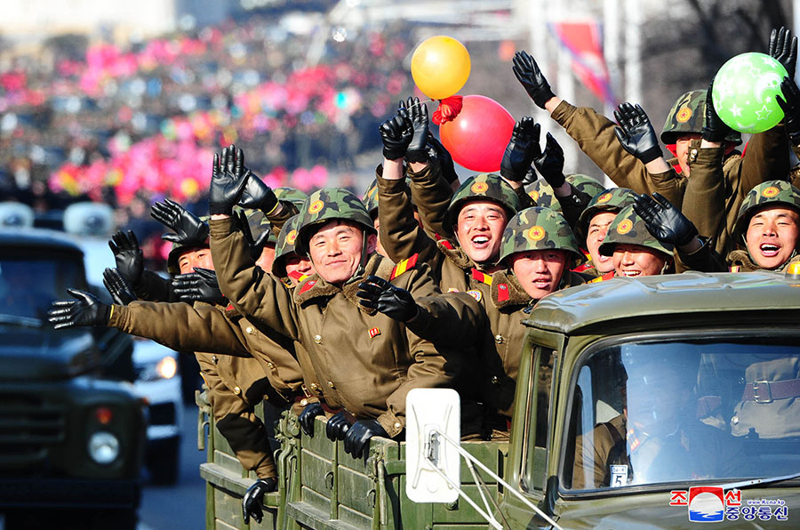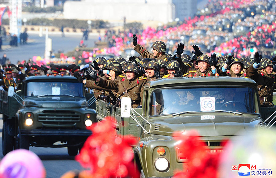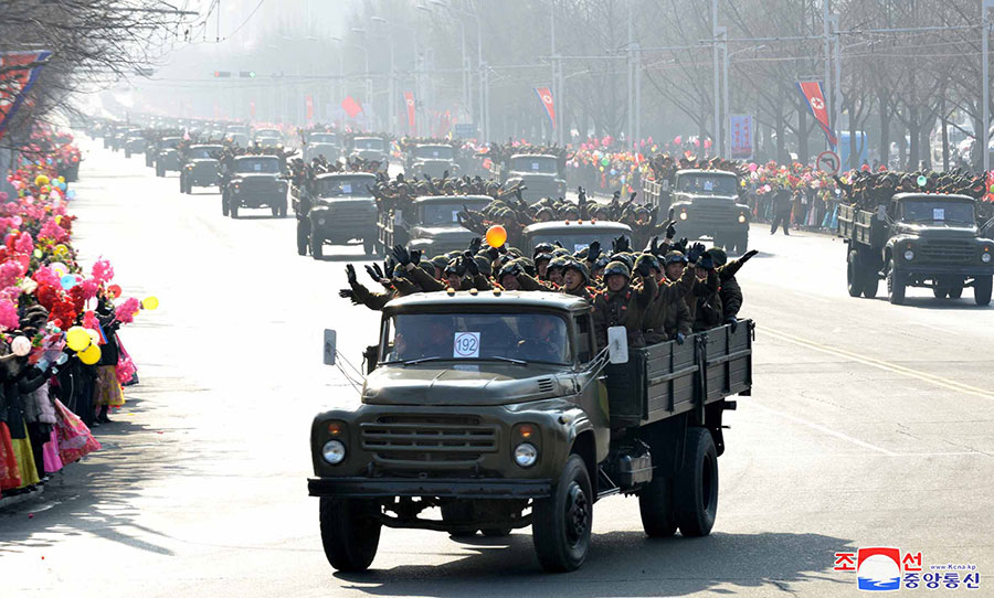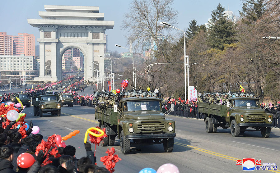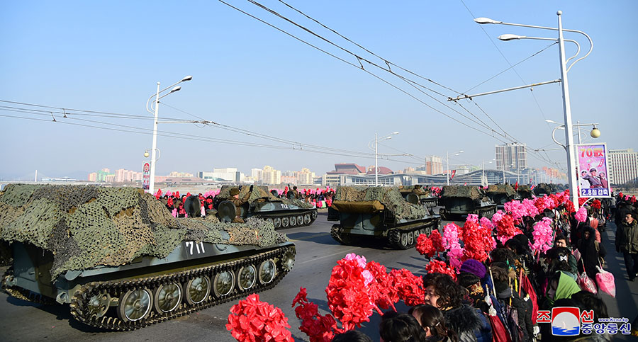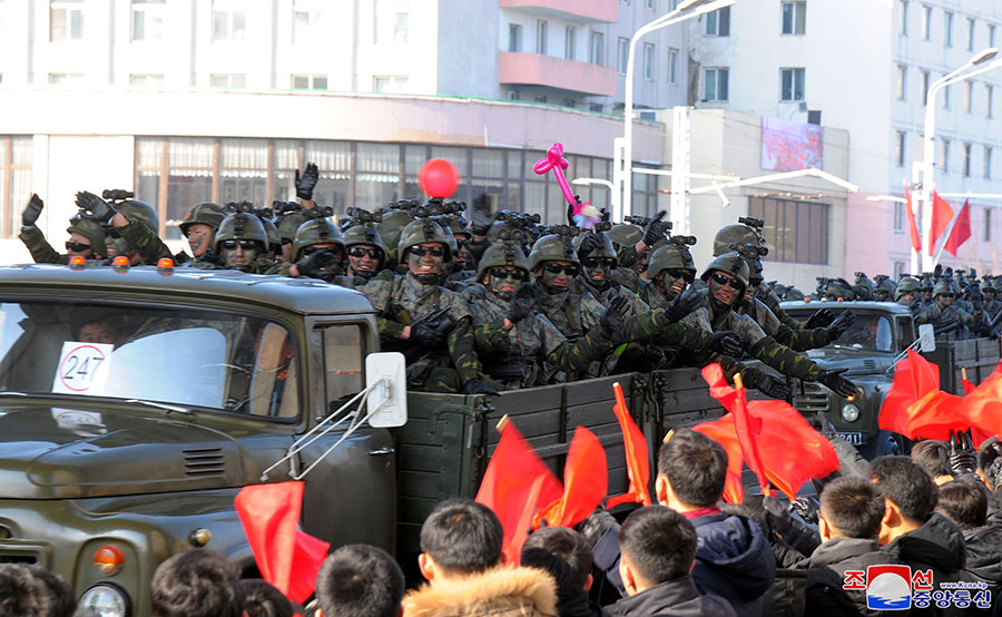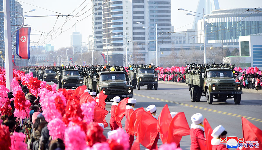 Pchjongjang, 9. února čučche 107 (2018) (KCNA) – Sloužící mužstvo, které se zúčastnilo velké vojenské přehlídky, která se konala za přítomnosti váženého nejvyššího vůdce soudruha Kim Čong Una k 70. výročí založení Korejské lidové armády, bylo ve čtvrtek uvítáno obyvateli Pchjongjangu v ulicích hlavního města.