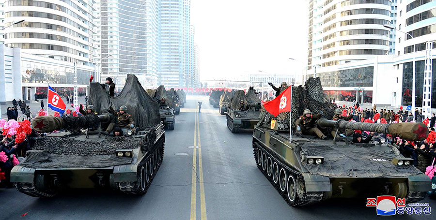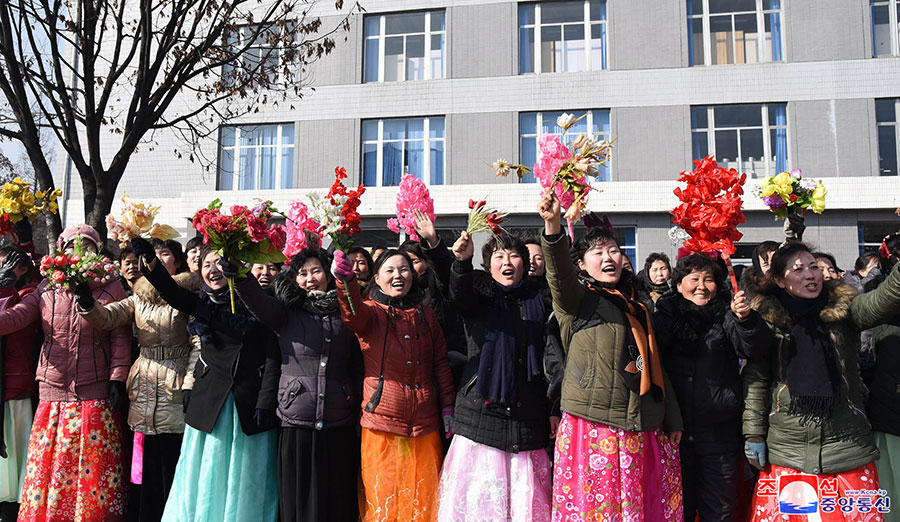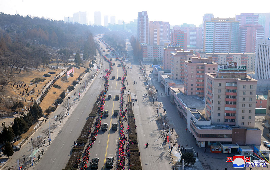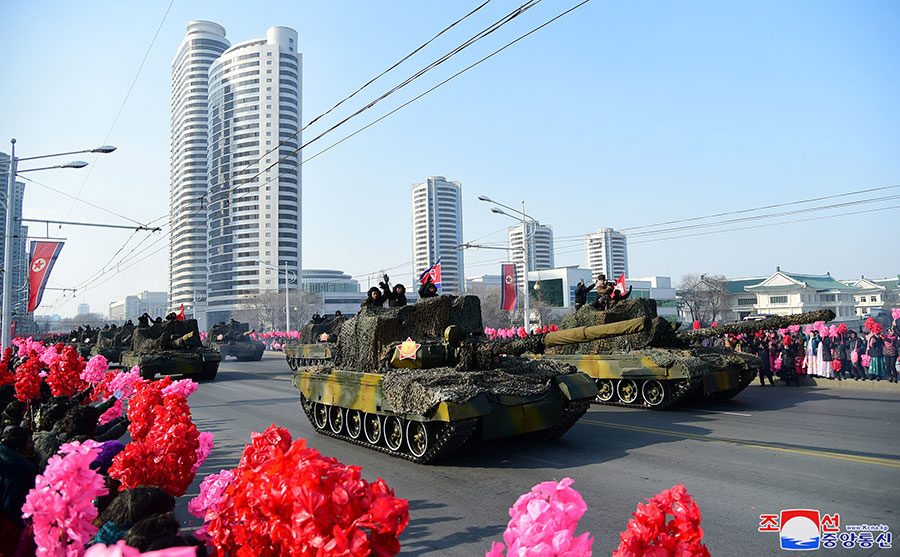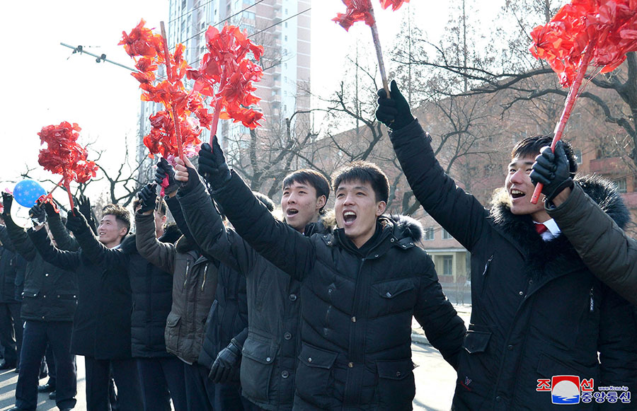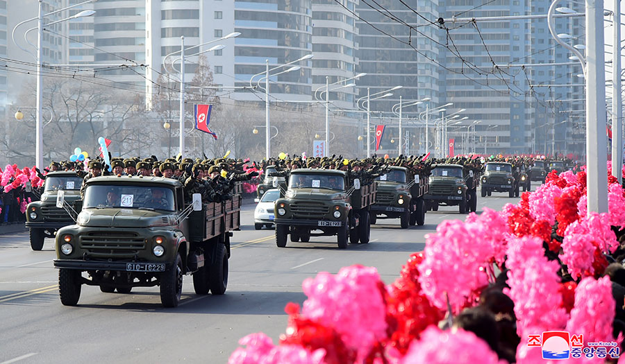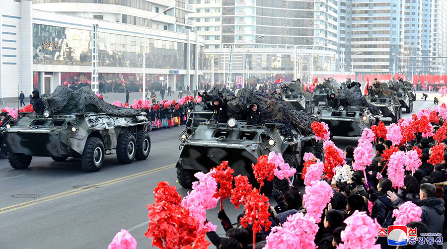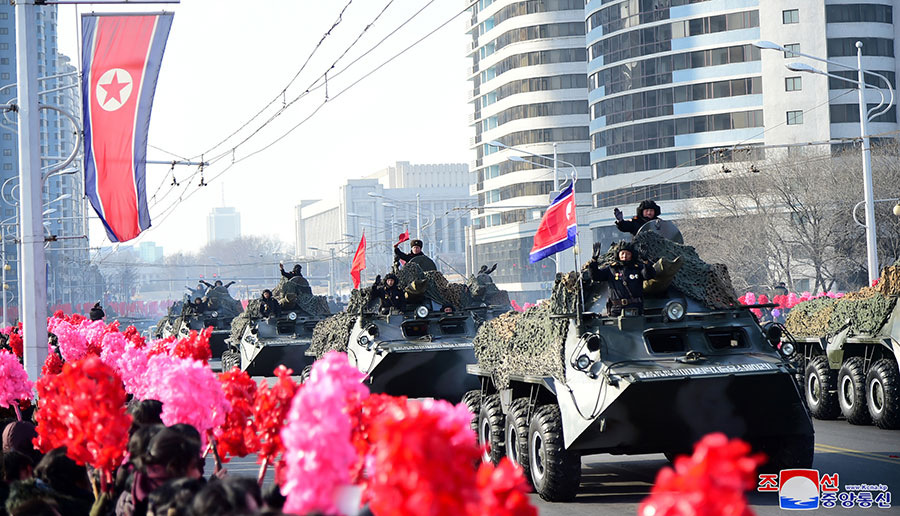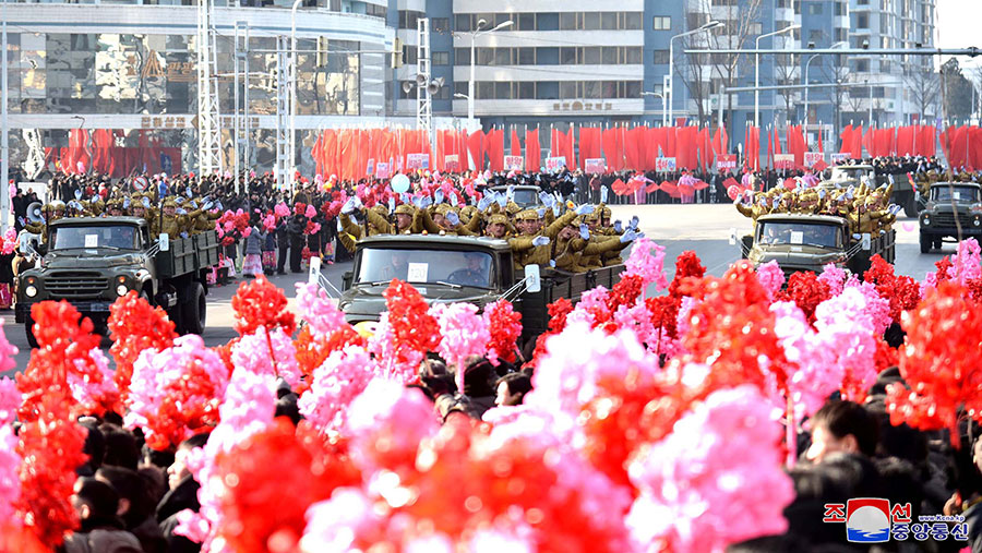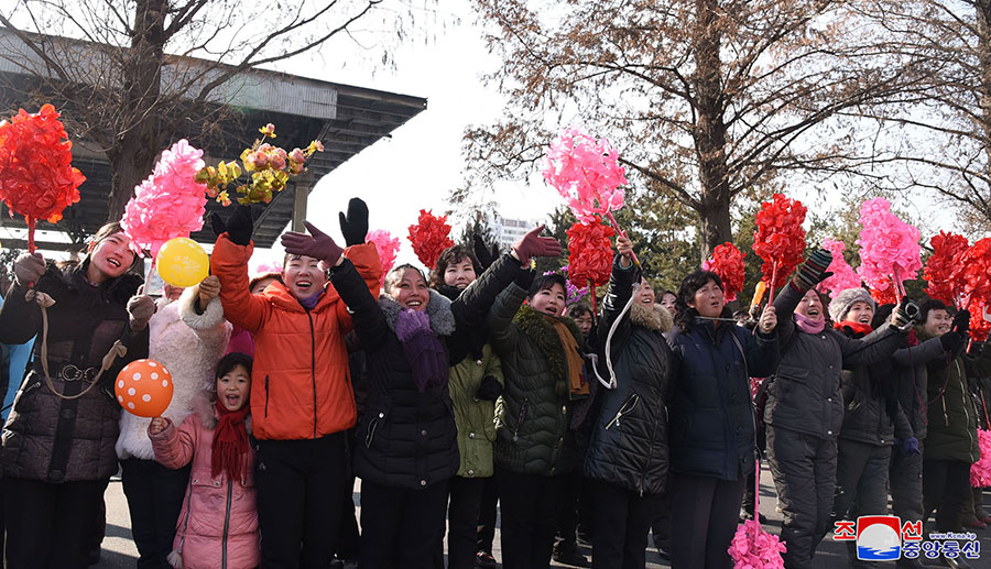 Pchjongjang, 9. února čučche 107 (2018) (KCNA) – Sloužící mužstvo, které se zúčastnilo velké vojenské přehlídky, která se konala za přítomnosti váženého nejvyššího vůdce soudruha Kim Čong Una k 70. výročí založení Korejské lidové armády, bylo ve čtvrtek uvítáno obyvateli Pchjongjangu v ulicích hlavního města.