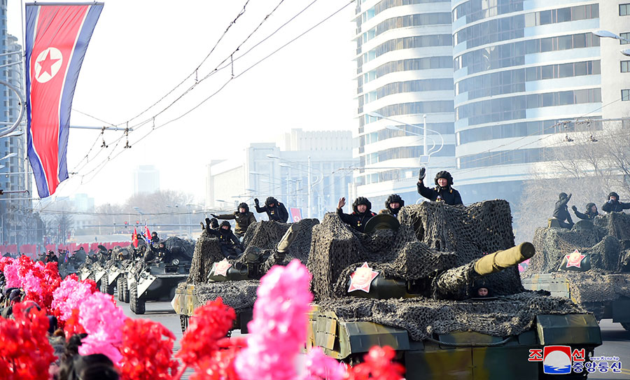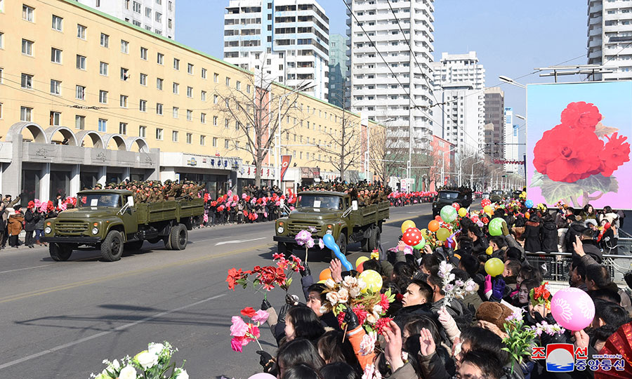 Motorové vozy, které vezly účastníky vojenské přehlídky, v čele s vozy s připevněnými vlajkami nesoucími portréty usměvavých velkých vůdců soudruhů Kim Ir Sena a Kim Čong Ila, sjely ze silnice před Pchjongjangským velkým divadlem. Pracující občané a mládež a studenti zamávali svazky květin, aby je pozdravili. Také cizinci a zahraniční krajané je srdečně uvítali.