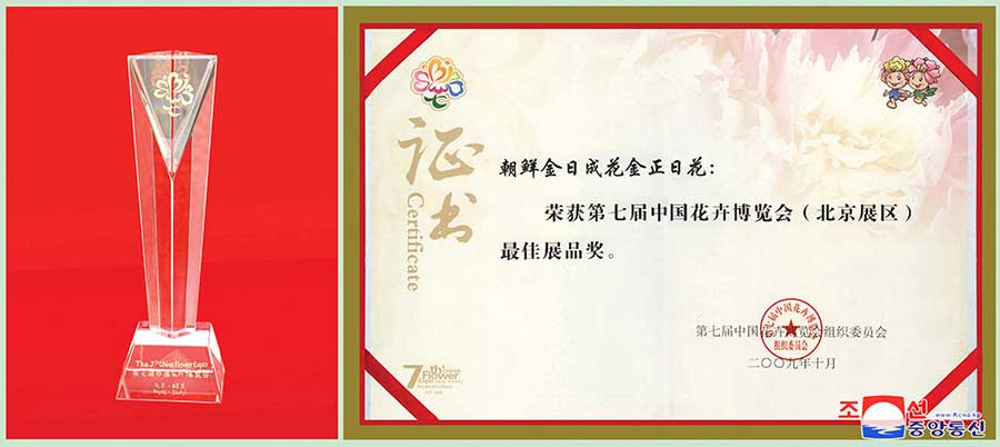 Kimčongilia si získala obdiv ľudí a chválu ihneď po jej zrodení. Získala špeciálnu cenu a zlatú medailu na 12. Medzinárodnej výstave kvetov v Bratislave v Československu v máji 1991, prvú cenu na kvetinovej výstave, ktorá sa konala v čínskom meste Ťi-lin v auguste 1997, Veľkú cenu na Medzinárodnej pestovateľskej expozícii v Kunmingu v roku 1999 a špeciálne ustanovenú zlatú cenu za výstavu v roku 2011 na Medzinárodnej kvetinárskej výstave v meste Si-an.