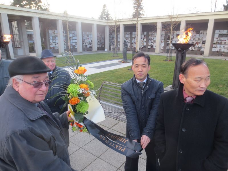 Zleva Jozef Servista, první místopředseda Společnosti česko-korejského přátelství Pektusan, Jiří Vábr, generální tajemník ÚV Komunistické strany Československa, Ma Čchol Chun, III. tajemník velvyslanectví KLDR a Kim Čchon Se, rada velvyslanectví KLDR, na pohřbu Jiřího Jarky v Praze 14. 2. čučche 107 (2018)