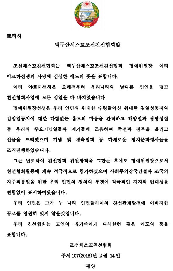 Společnost korejsko-českého přátelství vyjadřuje upřímnou soustrast s úmrtím čestného předsedy Společnosti česko-korejského přátelství PEKTUSAN, pana Jiřího Jarky.
