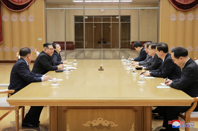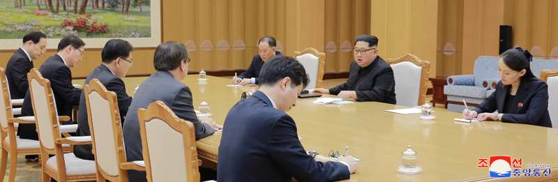 Pchjongjang, 6. března čučche 107 (2018) (KCNA) – Vážený nejvyšší vůdce soudruh Kim Čong Un, předseda Korejské strany práce (KSP), předseda Komise pro státní záležitosti KLDR a vrchní velitel Korejské lidové armády, se setkal se členy delegace zvláštního vyslance jihokorejského prezidenta, kteří v pondělí přijeli do Pchjongjangu.