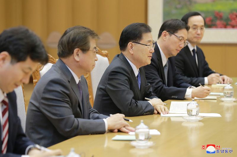 Přítomni byli Čong Ui Jong, vedoucí Úřadu státní bezpečnosti Modrého domu (Čchongwade), který je zvláštním vyslancem prezidenta Mun Če Ina; So Hun, ředitel Národní zpravodajské služby; Čchon He Song, viceministr sjednocení; Kim Sang Gjun, zástupce ředitele Národní zpravodajské služby; a Jun Kon Jong, vedoucí Úřadu pro státní záležitosti Čchongwade.