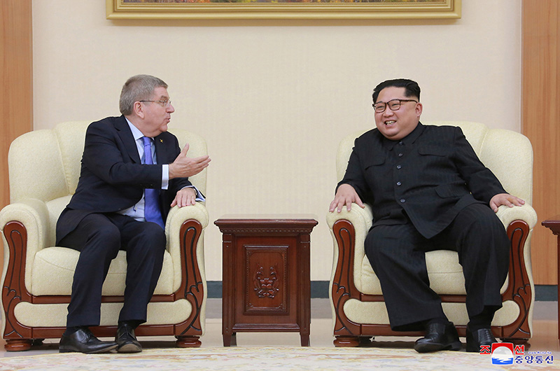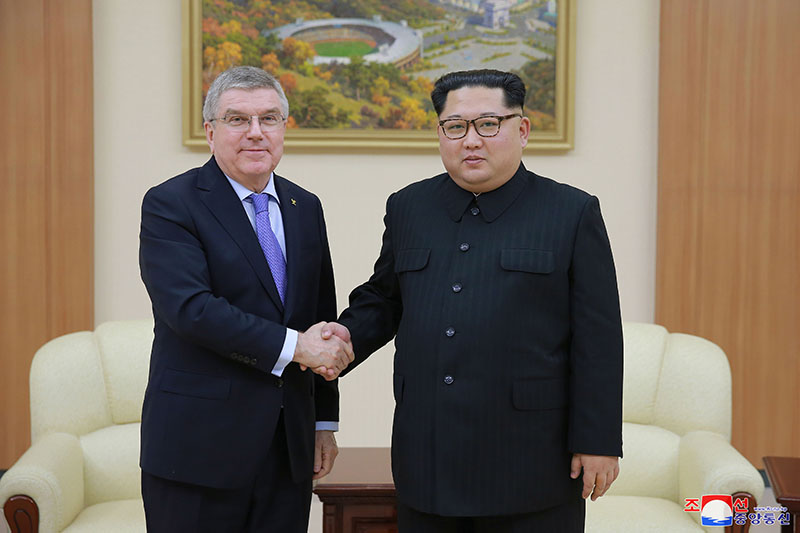 Pchjongjang, 31. března čučche 107 (2018) (KCNA) – Vážený nejvyšší vůdce soudruh Kim Čong Un, předseda Korejské strany práce, předseda Komise pro státní záležitosti KLDR a vrchní velitel Korejské lidové armády, přijal Thomase Bacha, předsedu Mezinárodního olympijského výboru (MOV) a jeho doprovod na návštěvě KLDR.