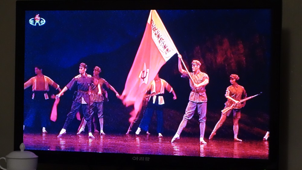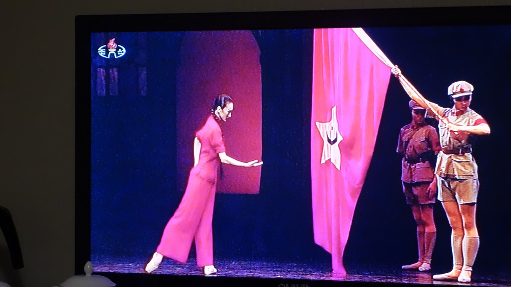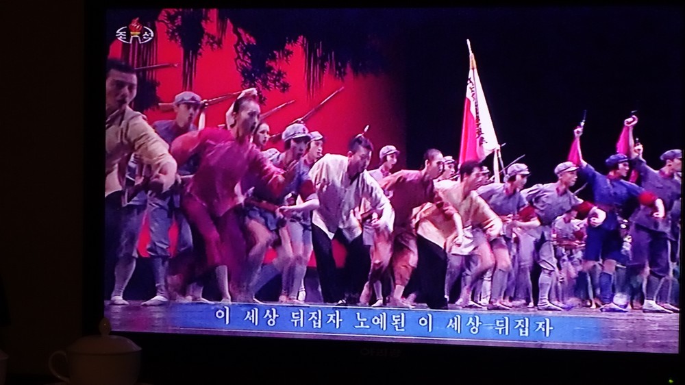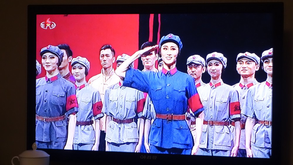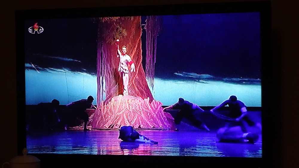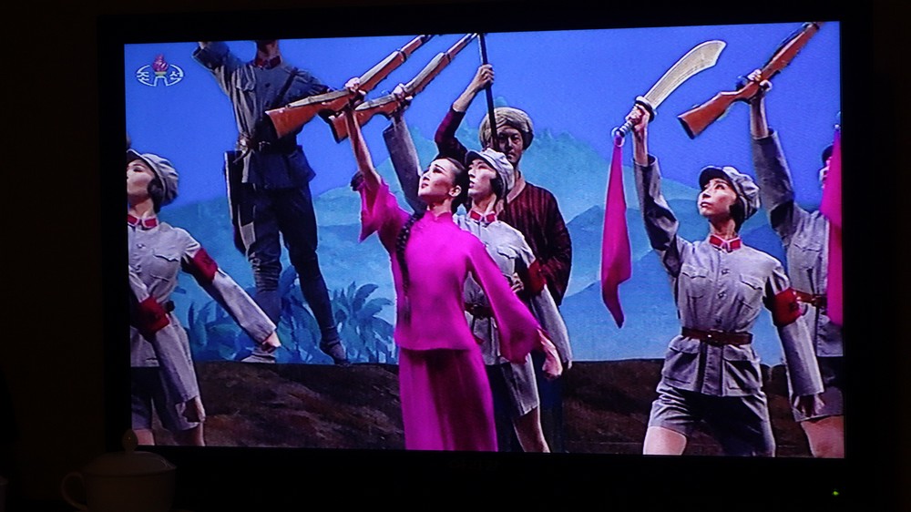 (Korejská ústřední televize – nafoceno během vysílání v hotelu Korjo v Pchjongjangu)