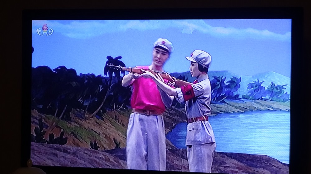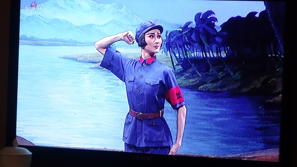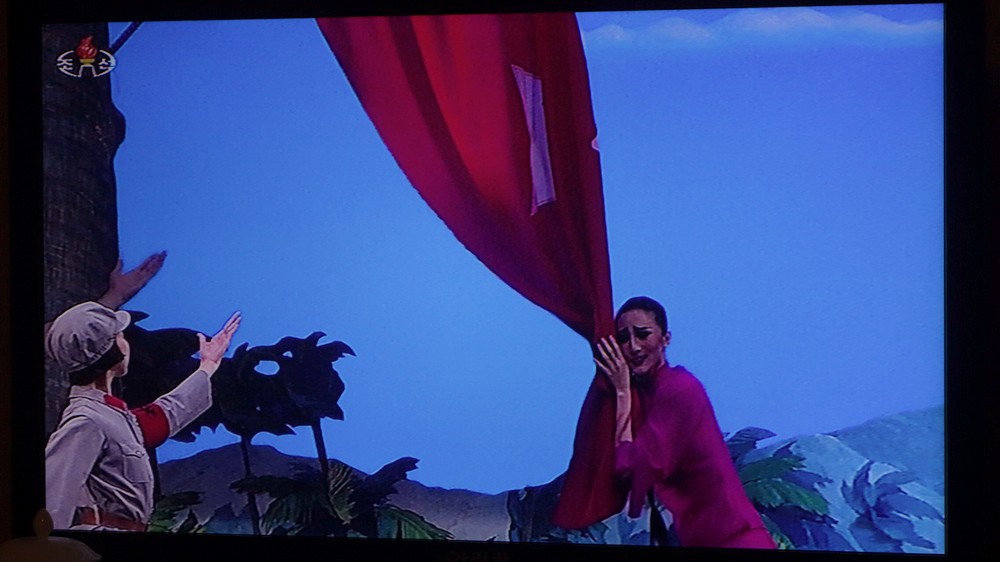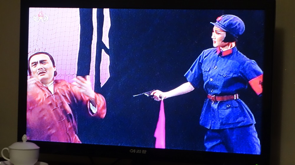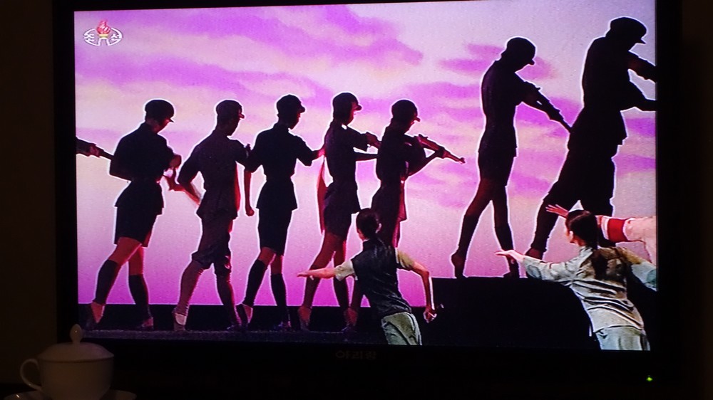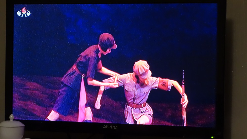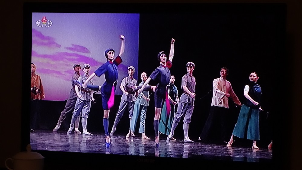 (Korejská ústřední televize – nafoceno během vysílání v hotelu Korjo v Pchjongjangu)