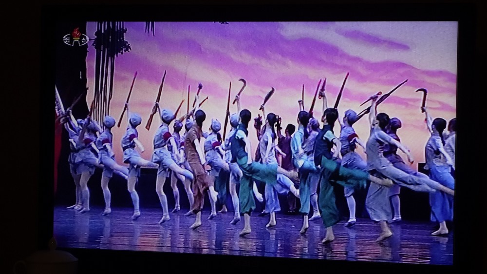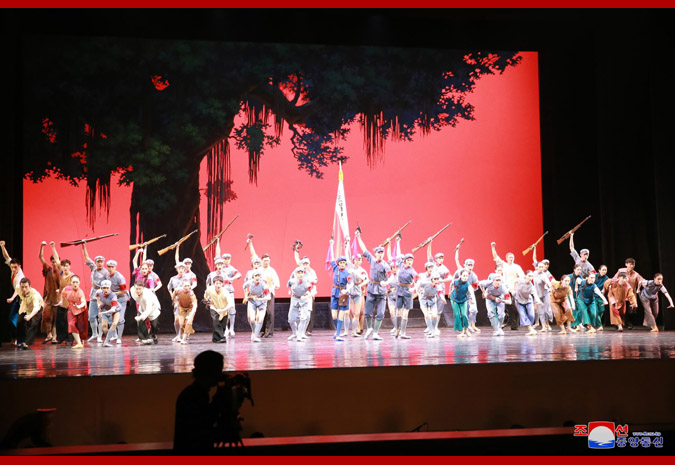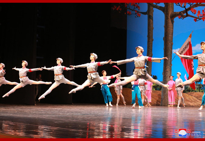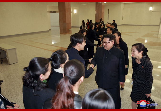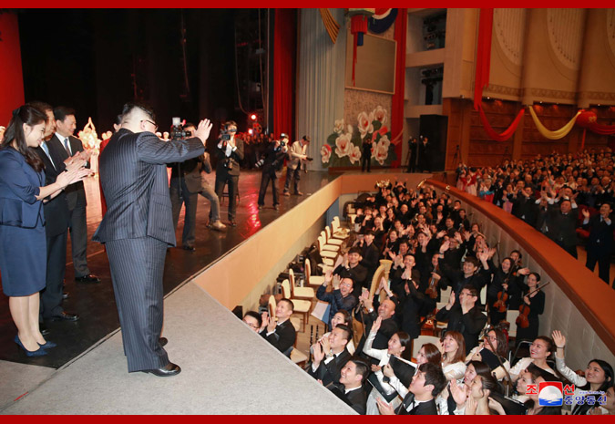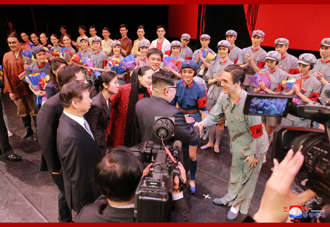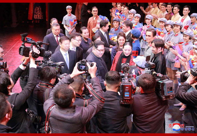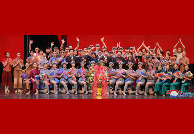Vážený soudruh nejvyšší vůdce společně se svou chotí Ri Sol Ču vystoupili na jeviště a podali si ruce s předními baletními umělci čínského uměleckého souboru a poblahopřáli jim k jejich úspěšnému vystoupení.