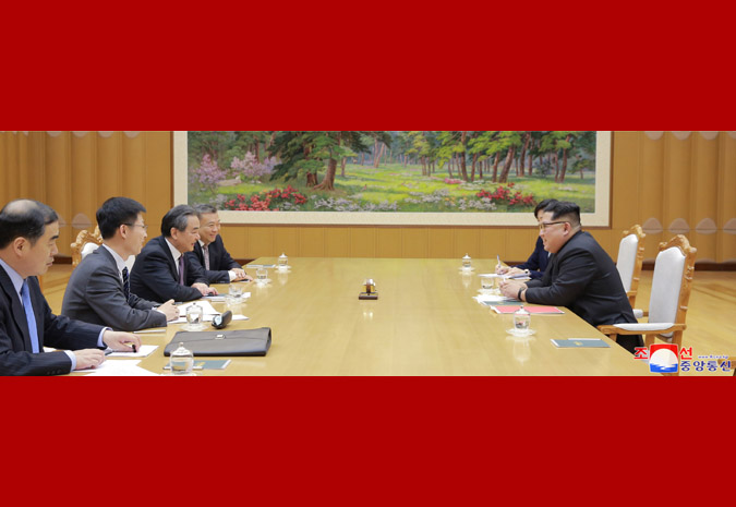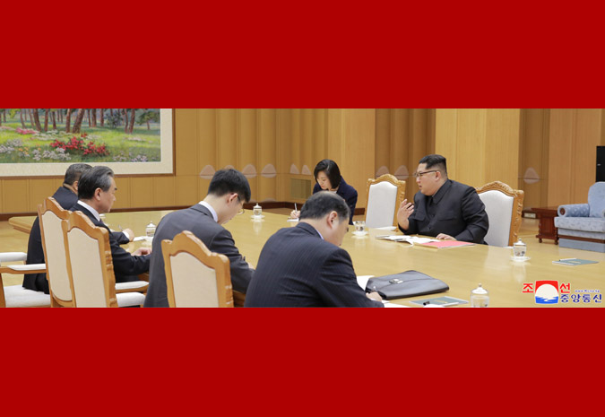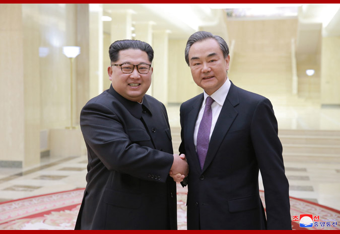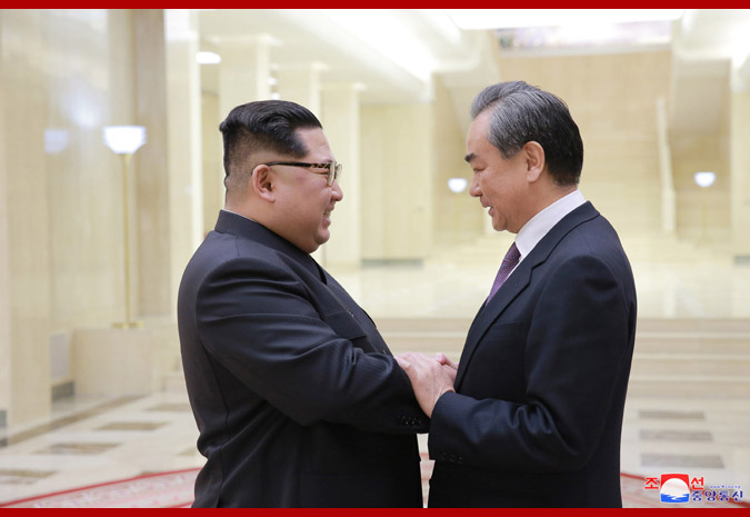 Pchjongjang, 4. května čučche 107 (2018) (KCNA) – Soudruh Kim Čong Un, předseda Korejské strany práce a předseda Komise pro státní záležitosti Korejské lidově demokratické republiky, nejvyšší vůdce naší strany, státu a armády, se ve čtvrtek 3. května setkal se soudruhem Wang Yi (Wang I), členem Státní rady a ministrem zahraničí Čínské lidové republiky, který je na návštěvě KLDR.
