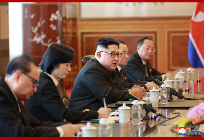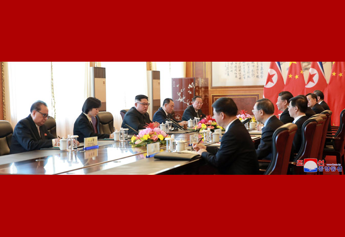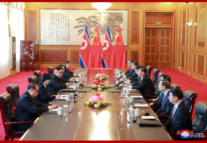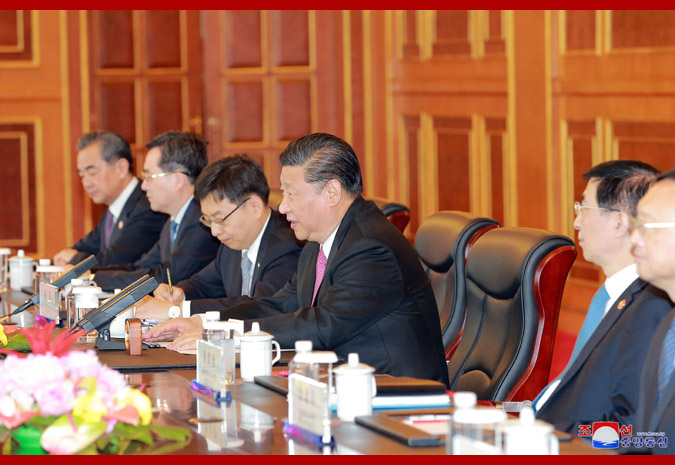 Poté se uskutečnily rozhovory mezi soudruhem Kim Čong Unem a soudruhem Si Ťin-pchingem. Jednání se zúčastnili ze strany KLDR soudruzi Ri Su Jong a Kim Jong Čchol, členové politického byra ÚV KSP a místopředsedové ÚV KSP, a soudruh Ri Jong Ho, člen Politického byra ÚV KSP a ministr zahraničí. Z čínské strany byli přítomni soudruh Wang Huning, člen stálého výboru Politického byra ÚV KS Číny a člen sekretariátu ÚV KS Číny, soudruh Ding Xuexiang, člen Politického byra ÚV KS Číny, člen sekretariátu ÚV KSP a ředitel Ústředního úřadu ÚV KS Číny, soudruh Wang Yi, člen státní rady a ministr zahraničí, a soudruh Song Tao, vedoucí oddělení mezinárodních vztahů ÚV KS Číny.