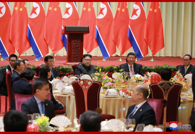Na počest návštěvy soudruha Kim Čong Una v Číně pořádal soudruh Si Ťin-pching recepci. Přítomni byli soudruzi Ri Su Jong a Kim Jong Čchol, členové politického byra ÚV KSP a místopředsedové ÚV KSP, soudruh Ri Jong Ho, člen Politického byra ÚV KSP a ministr zahraničí, soudružka Kim Jo Čong, náhradnice Politického byra ÚV KSP a první zástupkyně vedoucího oddělení ÚV KSP, a další vysocí funkcionáři a členové doprovodu. Zúčastnily se kádry čínské strany a vlády, mezi nimi soudruh Wang Huning, člen stálého výboru Politického byra ÚV KS Číny a člen sekretariátu ÚV KS Číny, soudruh Ding Xuexiang, člen Politického byra ÚV KS Číny, člen sekretariátu ÚV KSP a ředitel Ústředního úřadu ÚV KS Číny, soudruh Yang Jiechi, člen Politického byra ÚV KS Číny a ředitel Úřadu pro zahraniční věci ÚV KS Číny, soudruh Wang Yi, člen státní rady a ministr zahraničí, soudruh Song Tao, vedoucí oddělení mezinárodních vztahů ÚV KS Číny a další vedoucí představitelé čínské strany a vlády.
