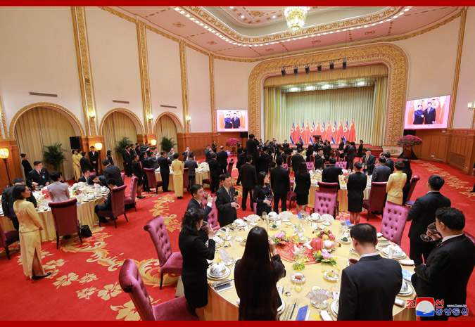Když soudruzi Kim Čong Un a Si Ťin-pching vstoupili do hodovní síně, všichni účastníci je s nadšením přivítali, přičemž vzdávali čest nejvyšším představitelům obou stran a obou zemí, kteří otevřeli novou fázi velkého přátelství mezi KLDR a Čínou.