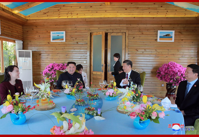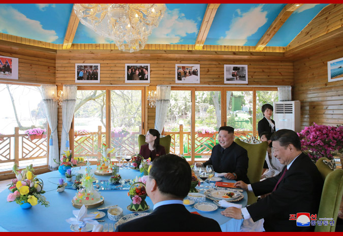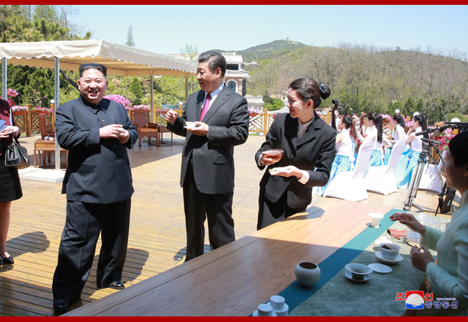Před obědem soudruzi Kim Čong Un a Si Ťin-pching ocenili dovednosti, které představují čajovou kulturu, a měli důležitý rozhovor. Oběd dále pomohl prohloubit mimořádné soudružské přátelství mezi nejvyššími vůdci obou stran a obou zemí.