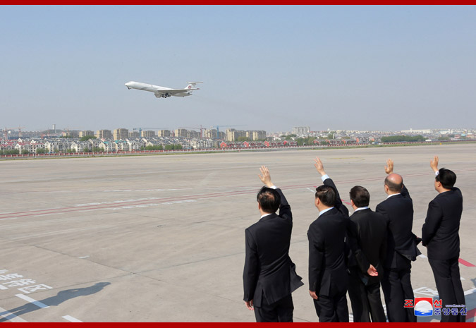 Soudruh Kim Čong Un ukončil svůj vyčerpávající program odpoledne v úterý 8. května a odletěl speciálním letadlem z Ta-lienu. Na ta-lienské mezinárodní letiště ho doprovázeli soudruh Wang Huning, člen stálého výboru Politického byra ÚV KS Číny a člen sekretariátu ÚV KS Číny, soudruh Song Tao, vedoucí oddělení mezinárodních vztahů ÚV KS Číny, soudruh Chen Qiufa, tajemník liao-ningského provinčního výboru KS Číny, a soudruh Tan Zuojun, tajemník Ta-lienského městského výboru KS Číny.