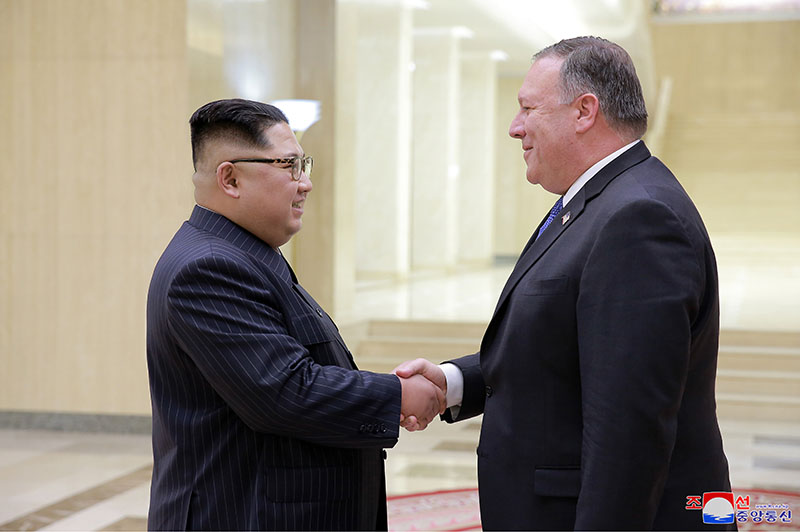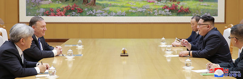 Mike Pompeo poděkoval váženému soudruhu nejvyššímu vůdci, že si našel čas, aby se s ním setkal, a řekl, že přiletěl do KLDR, aby osobně předal slovní zprávu prezidenta USA a připravil summit KLDR – USA. Poté předal soudruhu Kim Čong Unovi slovní zprávu Donalda Trumpa, prezidenta USA.