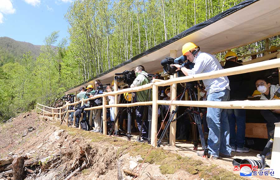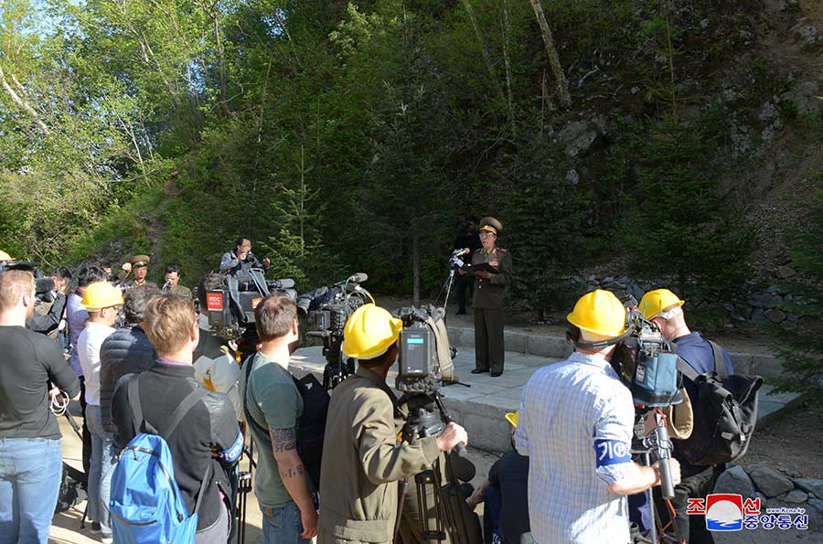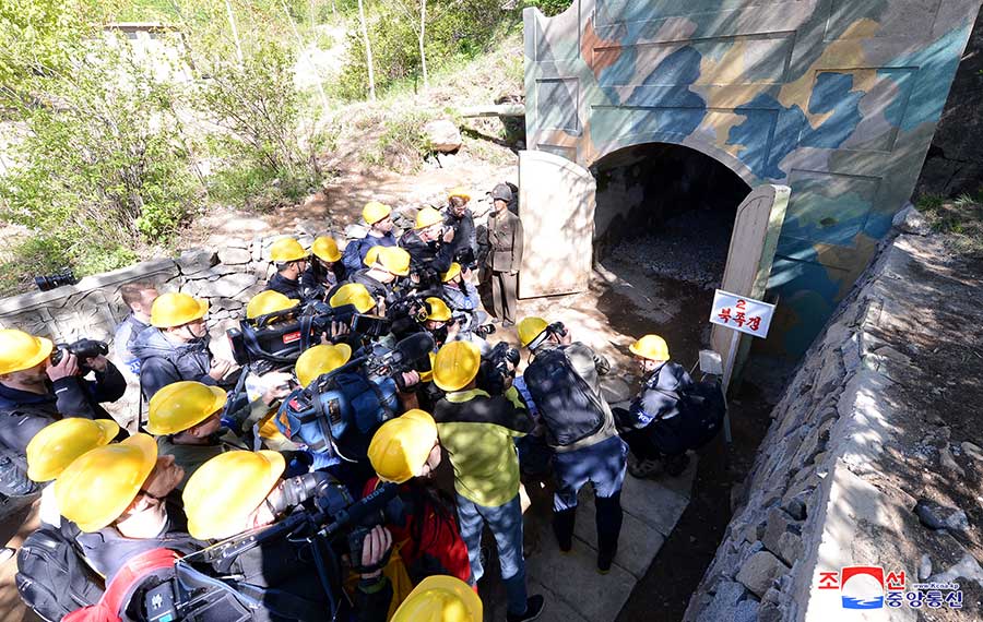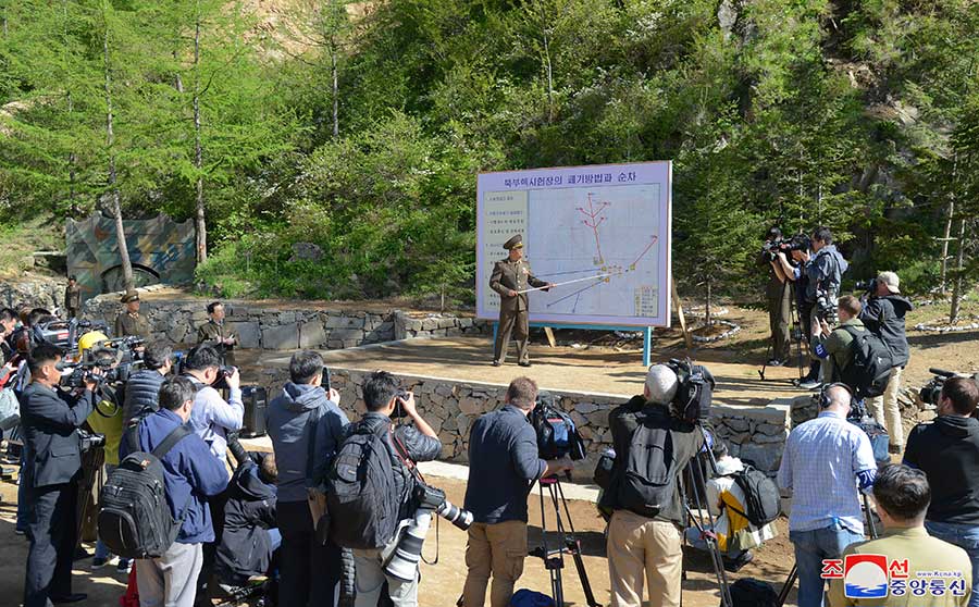 Proces demontáže byl sledován v terénu novináři z Číny, Ruska, USA, Británie a jižní Koreje. Členové mezinárodních tiskových sborů byli informováni o metodách a řádu demontáže zkušebního stanoviště a prošli tunely, kde byly v minulosti prováděny jaderné testy, tunely připravenými k okamžitému a bezpečnému provádění silných jaderných testů a centry sledování testů.