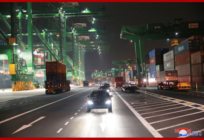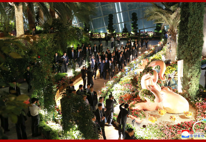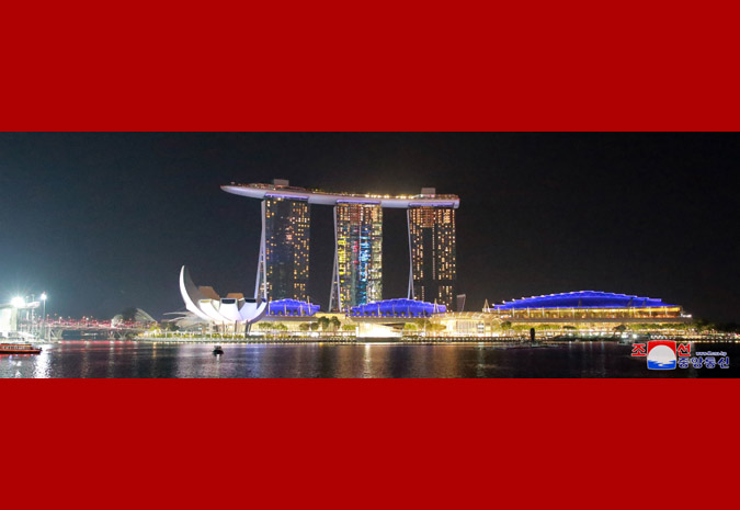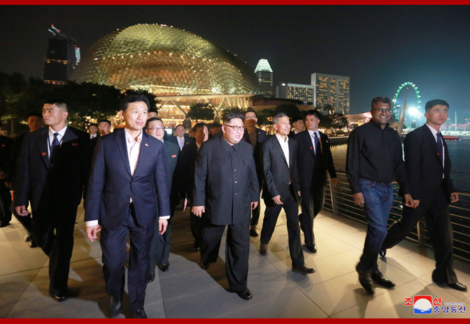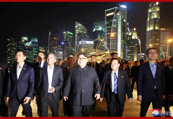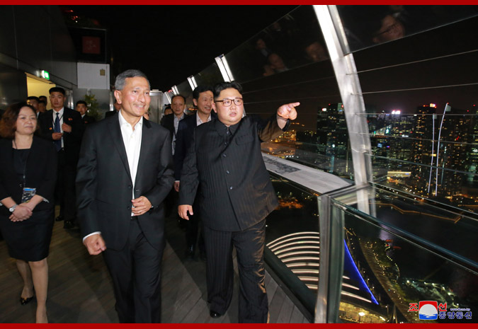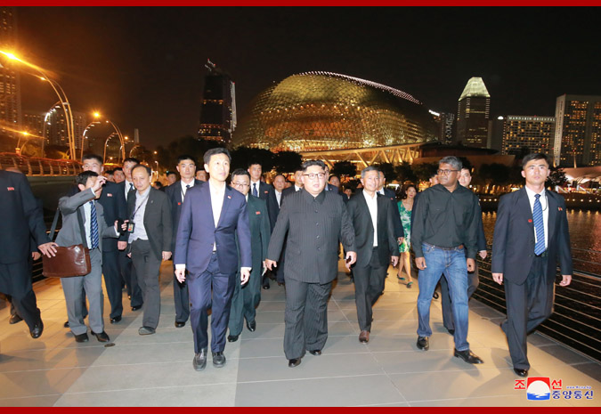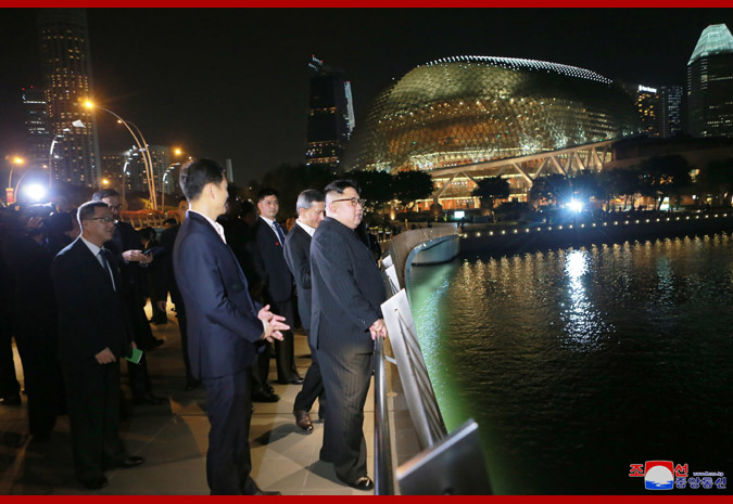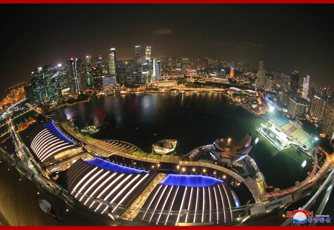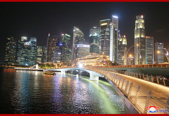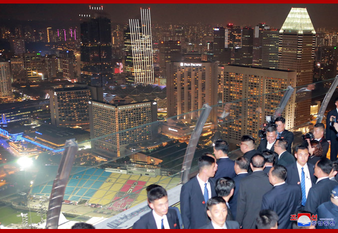Vážený soudruh nejvyšší vůdce, dívaje se na noční město z pozorovací plošiny budovy „Marina Bay Sands“, řekl, že Singapur je čistý a krásný a každá budova je stylová, jak o tom slyšel v minulosti, a dodal, že se hodně poučí z dobrých znalostí a zkušeností Singapuru v různých oblastech.