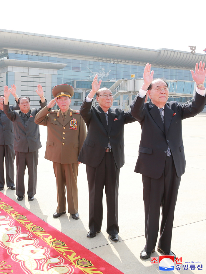 Na letišti se uskutečnil slavnostní obřad k odletu váženého soudruha nejvyššího vůdce a soudružky Ri Sol Ču. Váženého soudruha nejvyššího vůdce srdečně vyprovodili členové a náhradníci Politického byra Ústředního výboru KSP.