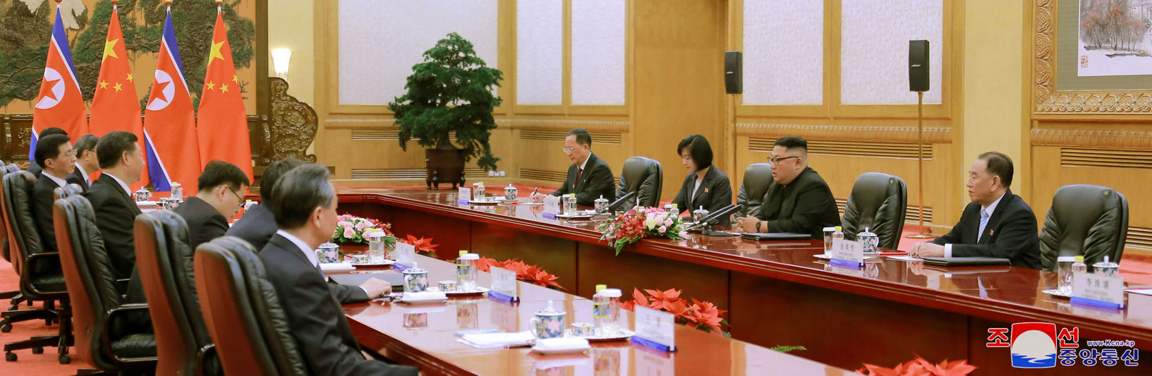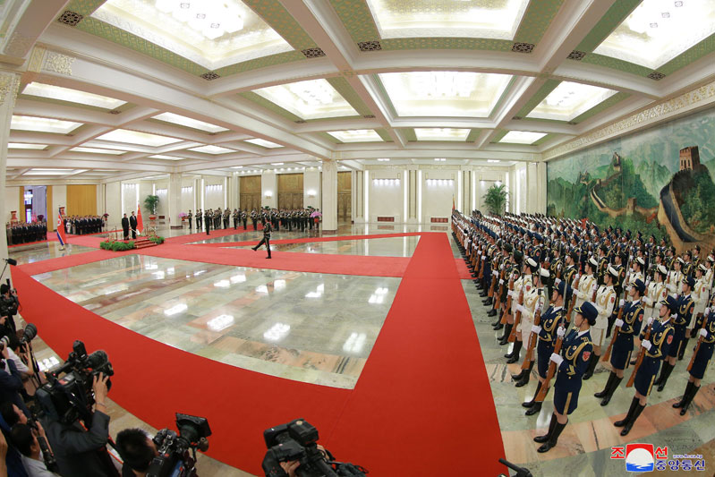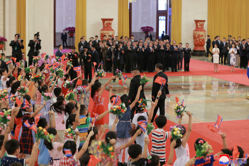 Soudruh Kim Čong Un, předseda Korejské strany práce a předseda Komise pro státní záležitosti Korejské lidově demokratické republiky, nejvyšší vůdce naší strany, státu a armády, se setkal se soudruhem Si Ťin-pchingem, generálním tajemníkem Ústředního výboru Komunistické strany Číny a prezidentem Čínské lidové republiky, ve Velké síni lidu v úterý 19. června v 17 hodin.