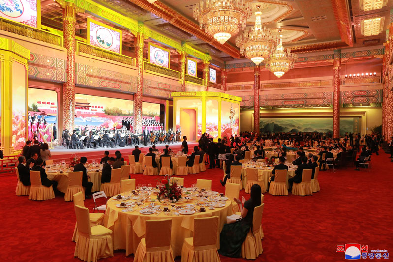 Soudruh Kim Čong Un a jeho žena Ri Sol Ču vstoupili do Zlatého sálu, hodovní síně, doprovázeli soudruhem Si Ťin-pchingem a jeho manželkou Peng Liyuan.
