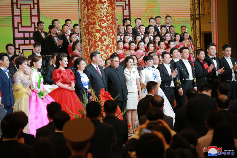 Vážený soudruh nejvyšší vůdce a jeho manželka Ri Sol Ču společně se soudruhem Si Ťin-pchingem a jeho ženou Peng Liyuan vystoupili na jeviště, aby vyjádřili poděkování za nadšení a úsilí umělců, kteří připravovali představení s celou duší, a vyfotografovali se s nimi.