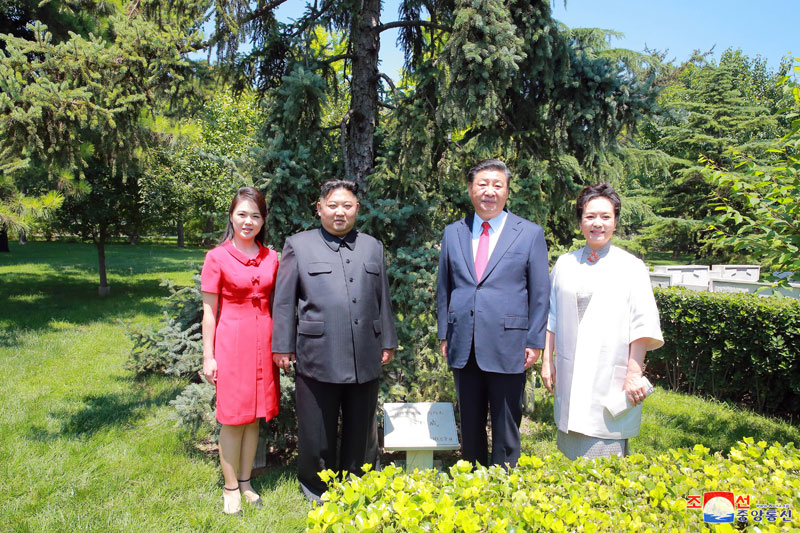 Vážený soudruh nejvyšší vůdce a první dáma Ri Sol Ču se v dopoledních hodinách dne 20. června znovu šťastně setkali se soudruhem Si Ťin-pchingem a jeho manželkou Peng Liyuan.