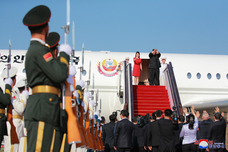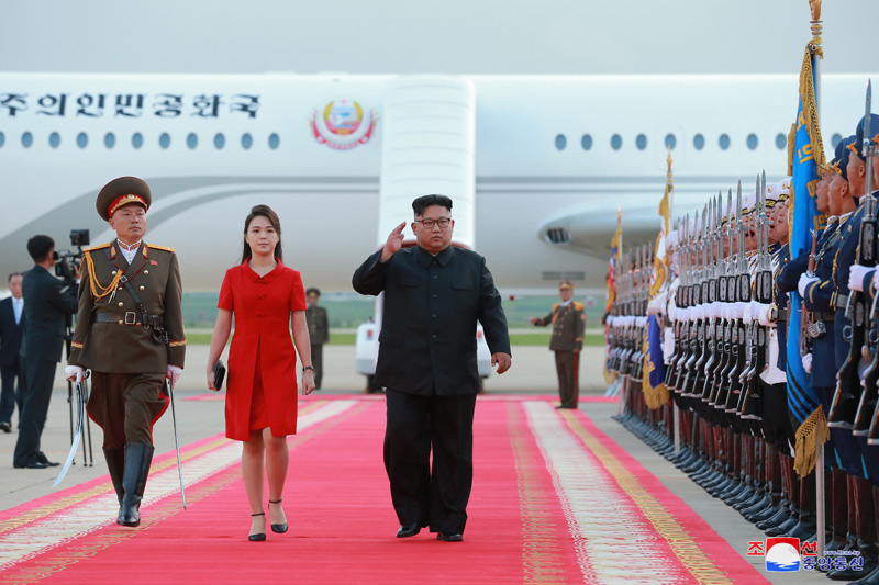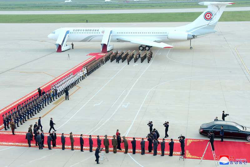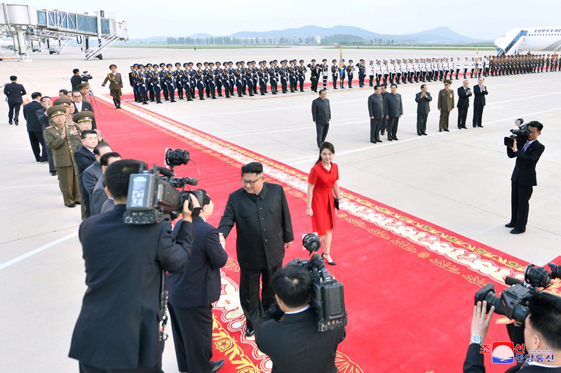 Na letišti se konal obřad k přivítání váženého soudruha nejvyššího vůdce a jeho ženy Ri Sol Ču.