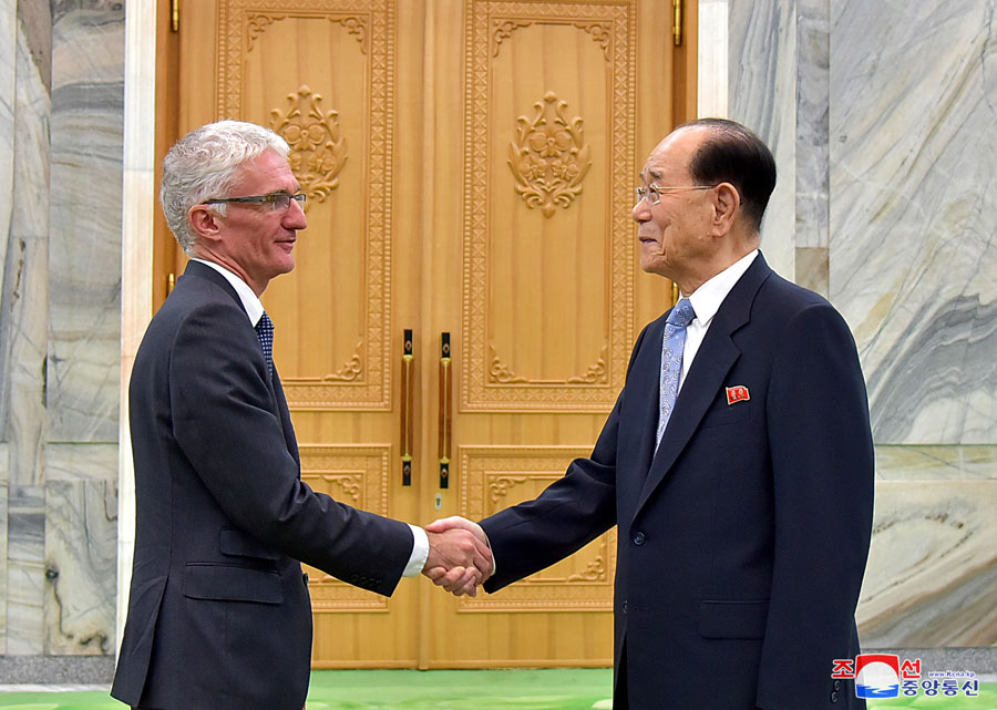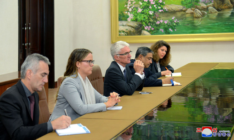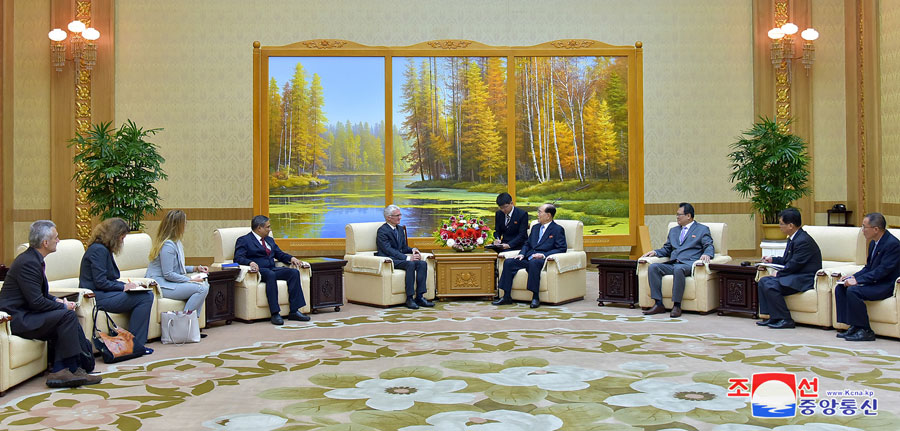 Ministr veřejného zdraví KLDR soudruh Čang Čun Sang jednal s Markem Andrewem Lowcockem a jeho doprovodem ve středu 11. července při návštěvě v Lidovém paláci kultury.