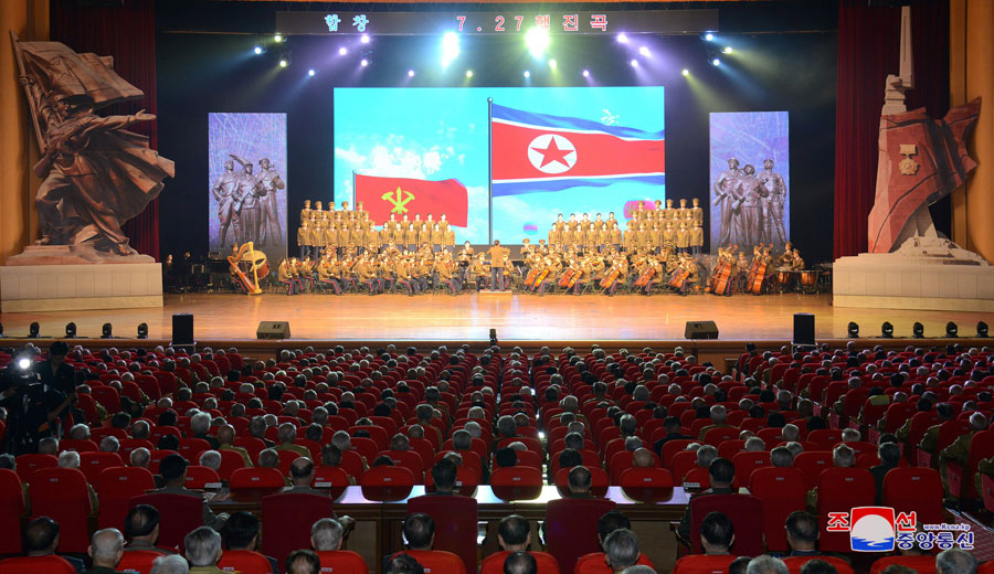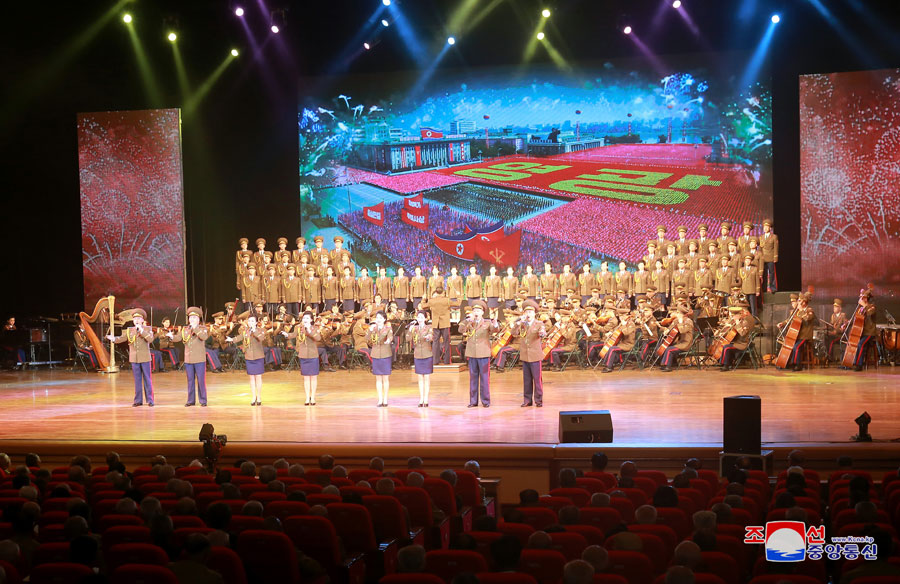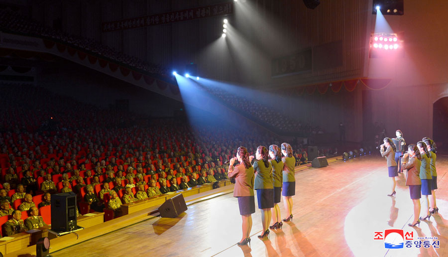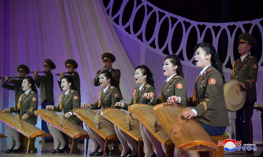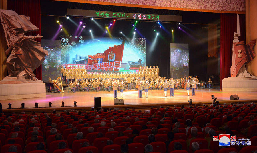 Umělci zaníceně pěli vysokou chválu nesmrtelným revolučním činům velkého vůdce soudruha Kim Ir Sena a velkého vůdce soudruha Kim Čong Ila, kteří vytvořili pověstné válečné vítězství bezpříkladné ve světových dějinách válek a dosahovali vítězství za vítězstvím v úsilí o obranu socialismu.