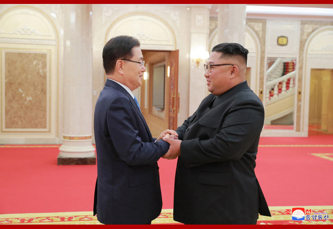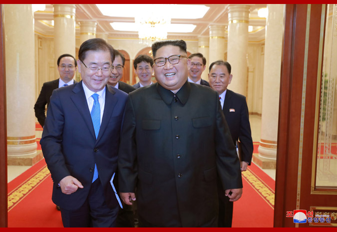 Pchjongjang, 6. září čučche 107 (2018) (KCNA) – Předseda Korejské strany práce, předseda Komise pro státní záležitosti KLDR a vrchní velitel Korejské lidové armády, nejvyšší vůdce naší strany, státu a armády soudruh Kim Čong Un přijal v sídle Ústředního výboru Korejské strany práce členy delegace zvláštního vyslance jihokorejského prezidenta Mun Če Ina, kteří ve středu 5. září navštívili Pchjongjang.