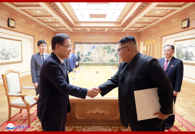 Vážený soudruh nejvyšší vůdce provedl širokou výměnu názorů s delegací zvláštního vyslance ohledně setkání na nejvyšší úrovni v Pchjongjangu, které má proběhnout v září, a o jeho tématech, a dosáhli uspokojivé dohody. Rovněž s nimi otevřeně hovořil o mnoha otázkách, které vznikají při urychlování rozvoje severo-jižních vztahů a při zachování míru a stability Korejského poloostrova.