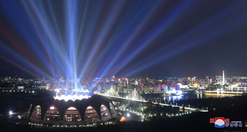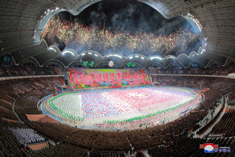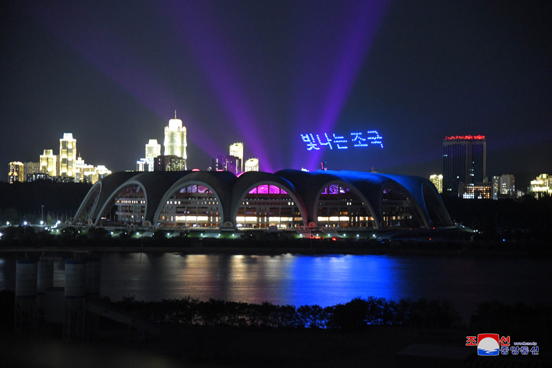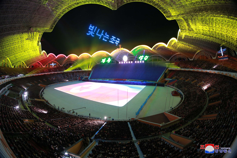 Se zobrazením nápisu „Zářící vlast“ na noční obloze, odrážejícího neporazitelnou moc KLDR, se rozvinulo moře tance.