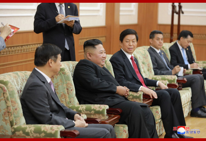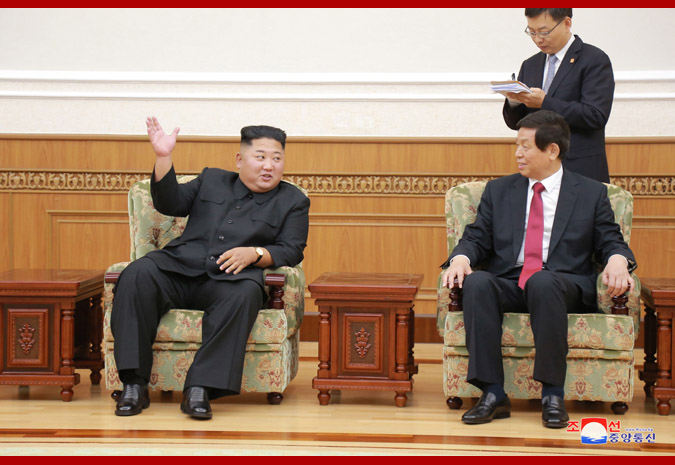 Vážený soudruh nejvyšší vůdce vedl přívětivý rozhovor se soudruhem Li Šan-ču a jeho členy delegace.