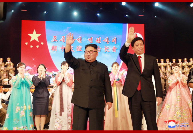 Když se v hledišti objevil vážený soudruh nejvyšší vůdce, po kterém následovali čínští hosté včetně soudruha Li Šan-ču, diváci začali nadšeně tleskat, vyjadřujíce největší slávu a nejsrdečnější pozdravy váženému soudruhu nejvyššímu vůdci, který nesmrtelně přispěl k posílení a rozvoji přátelství mezi KLDR a Čínou.