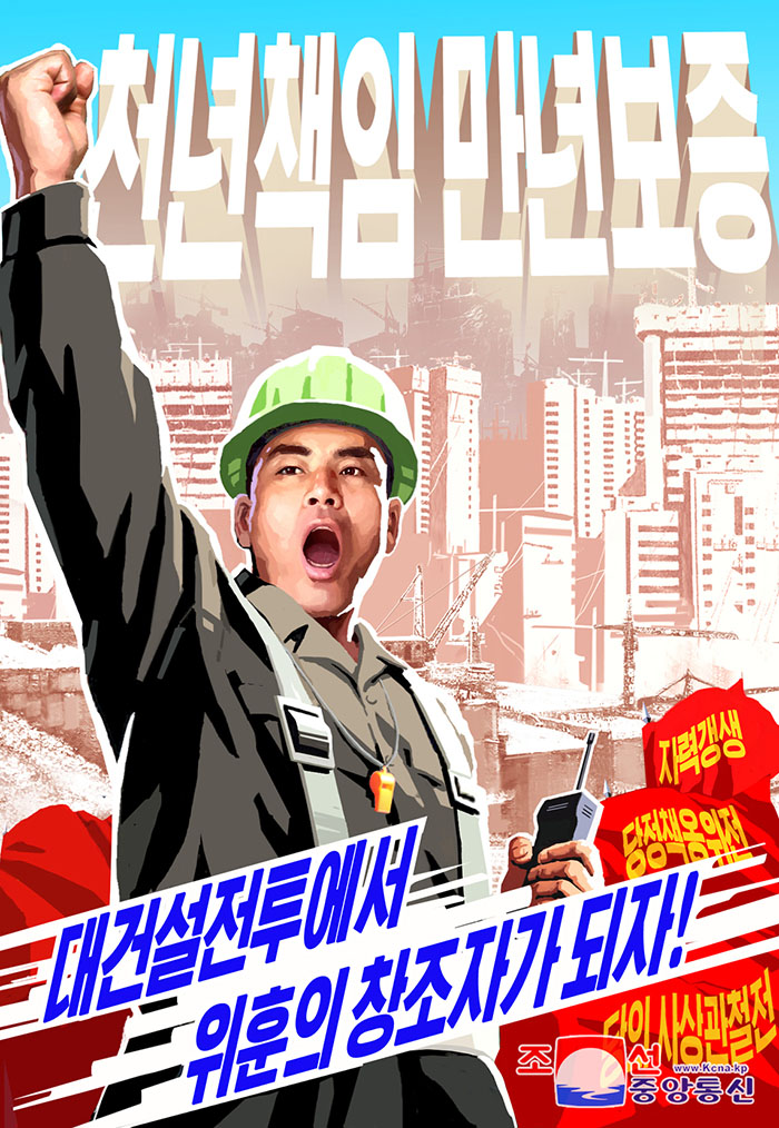 Plakát „Staňme se představiteli pracovních zásluh ve velkém boji za výstavbu!“ charakterizovaný hesly „Spoléhání na vlastní síly“, „Nápor k obraně politiky strany“ a „Nápor k uskutečnění myšlenek strany“ vyzývá všechny budovatele, aby zajistili rychlost a kvalitu výstavby na nejvyšší úrovni, založené na principu „nést odpovědnost za tisíc let a záruku za deset tisíc let“, a stali se představiteli pracovních zásluh v dnešním velkém budovatelském úsilí.