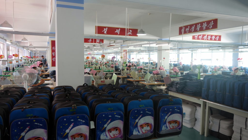 Poobede sme sa išli pozrieť do závodu na výrobu tašiek, ktorý bol otvorený v roku čučche 106 (2017). Vyrába sa v ňom viac ako 300 druhov tašiek pre deti a mládež. Čínske tašky mali nepriaznivý vplyv na pokožku detí, preto vážený najvyšší vodca súdruh Kim Čong Un rozhodol, že treba vyrábať tašky vlastnej výroby, ktoré budú ľahké, príjemné na nosenie a z kvalitných materiálov.
