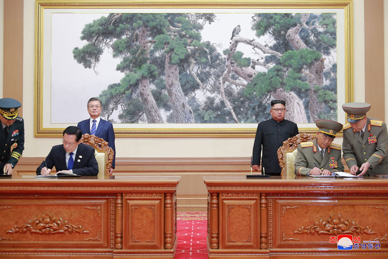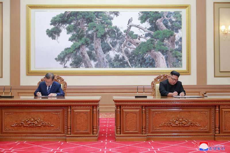 Předseda Korejské strany práce a předseda Komise pro státní záležitosti Korejské lidově demokratické republiky, nejvyšší vůdce naší strany, státu a armády soudruh Kim Čong Un, podepsal 19. září spolu s prezidentem Mun Če Inem „Zářijovou pchjongjangskou společnou deklaraci“ .