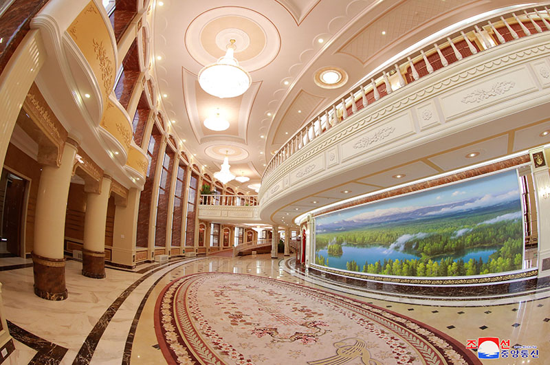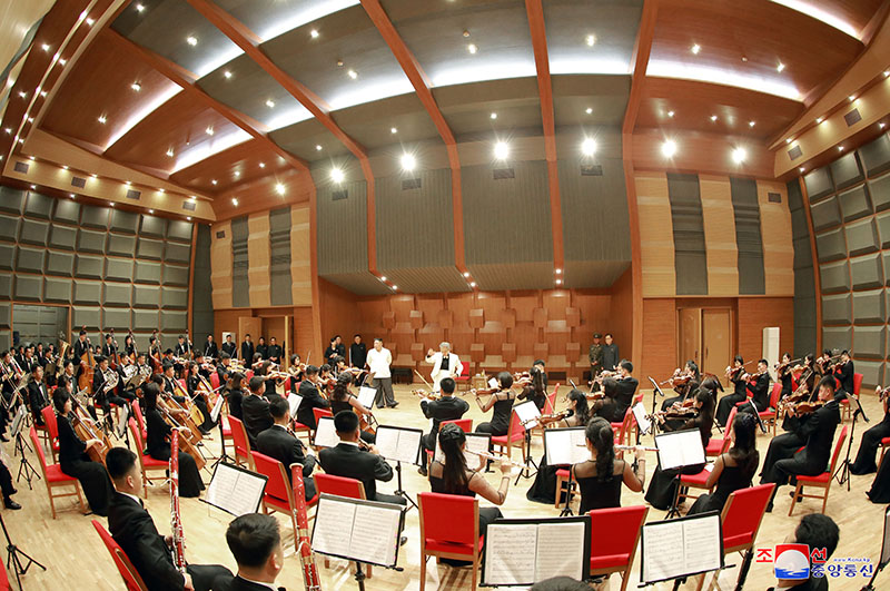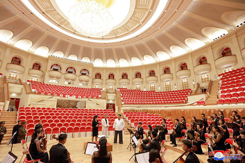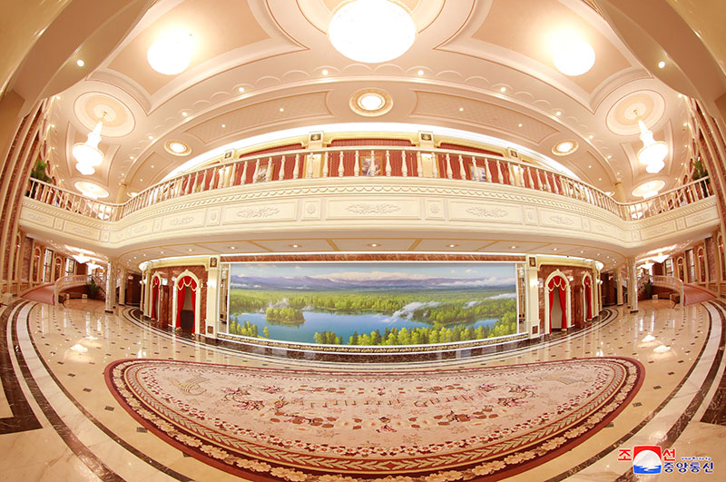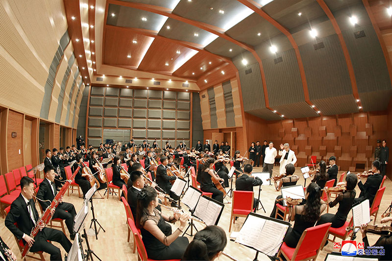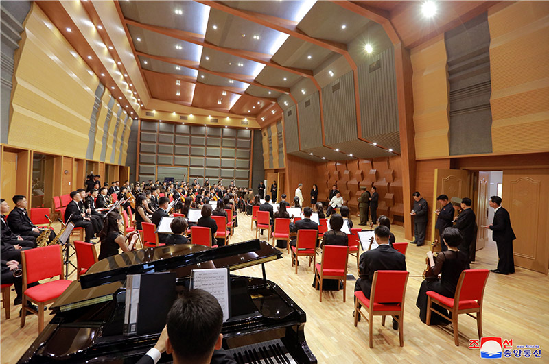 Vážený soudruh nejvyšší vůdce navštívil jedno po druhém různá místa, včetně budovy pro tvorbu, budovy pro zkoušky, nahrávací studia, prostory pro odpočinek, a seznámil se se stavbou a přípravami na provoz. Řekl, že divadlo je půvabné a jemné, nádherné a okouzlující ve formě i obsahu architektury, a současně moderně spojuje uměleckou harmonii moderní a klasické krásy. Můžeme být hrdi na to, že taková bezchybná koncertní síň byla postavena na základě akustického návrhu založeného na moderní vědě a technologii, řekl a vyjádřil velkou spokojenost s tím, že divadlo je skvělým chrámem umění a designu, pozoruhodné svou originalitou a stavbou provedenou na nejvyšší úrovni.