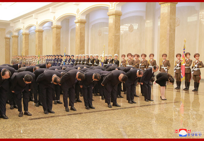 V sálech nesmrtelnosti, kde leží soudruh Kim Ir Sen a soudruh Kim Čong Il ve svém životním vzhledu, jim vážený soudruh nejvyšší vůdce projevil hlubokou úctu a poklonil se.