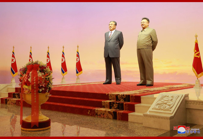 Vážený soudruh nejvyšší vůdce společně s dalšími účastníky vyjádřil hlubokou úctu a přání nesmrtelnosti soudruhu Kim Ir Senovi a soudruhu Kim Čong Ilovi.