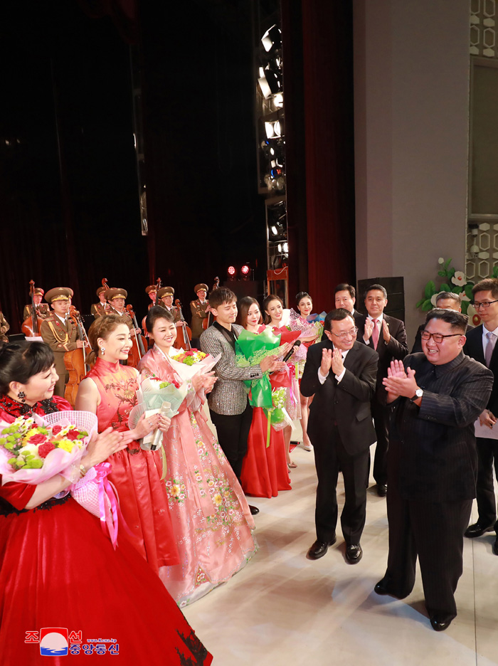 Váženého nejvyššího vůdce soudruha Kim Čong Una v divadle přivítali soudruh Rak Su Kang (Luo Shugang), ministr kultury a cestovního ruchu Číny; soudruh Wang A Kun (Wang Yajun), zástupce vedoucího oddělení mezinárodních styků ÚV Komunistické strany Číny; soudruh Ri Kun (Li Qun), náměstek ministra kultury a cestovního ruchu Číny a další členové čínské umělecké delegace a soudruh Ri Čin Gun (Li Jinjun), čínský velvyslanec v KLDR.