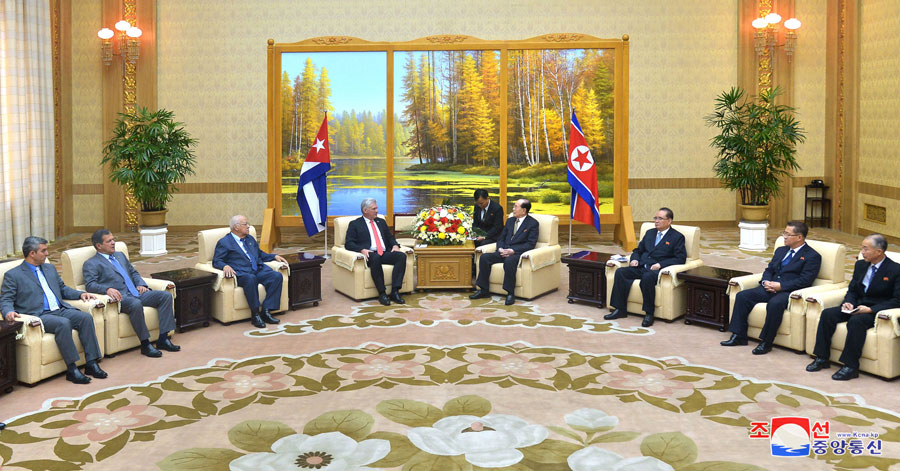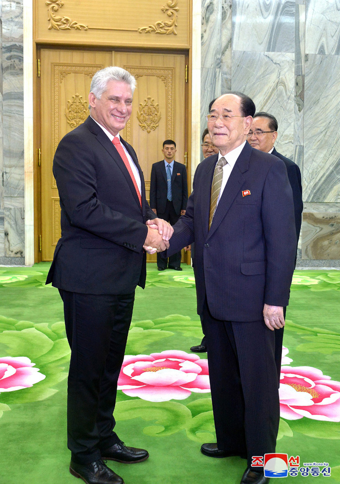 Soudruh Kim Jong Nam, člen prezídia politického byra Ústředního výboru Korejské strany práce a předseda prezídia Nejvyššího lidového shromáždění Korejské lidově demokratické republiky se setkal v pondělí 5. listopadu v sále shromáždění Mansude se soudruhem Miguelem Mariem Díaz-Canelem Bermudézem, předsedou Státní rady a předsedou Rady ministrů Kubánské republiky, který provedl protokolární návštěvu.