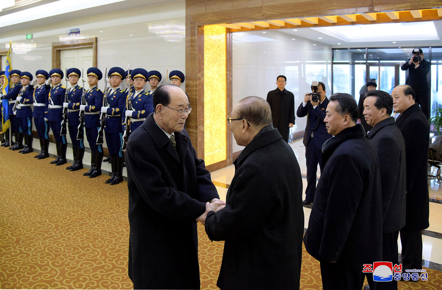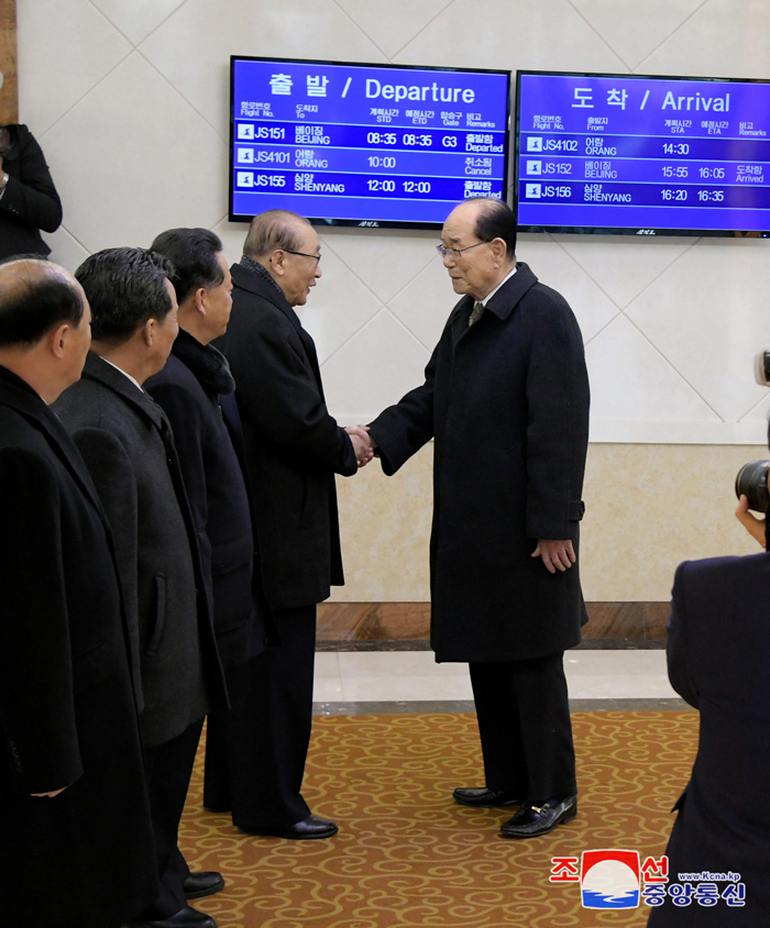 Delegace KLDR byla přivítána soudruhem Jang Hjong Sopem, místopředsedou prezídia Nejvyššího lidového shromáždění, soudruhem Ri Rjong Namem, místopředsedou vlády, soudruhem Rju Mjong Sonem, zástupcem vedoucího oddělení Ústředního výboru Korejské strany práce, a soudruhem Sin Hong Čcholem, náměstkem ministra zahraničních věcí.