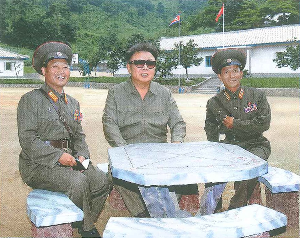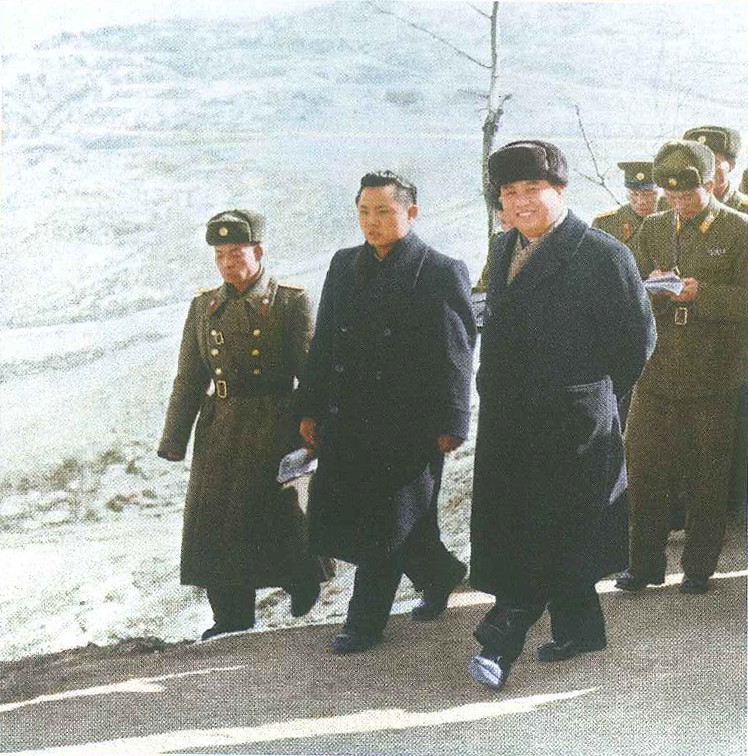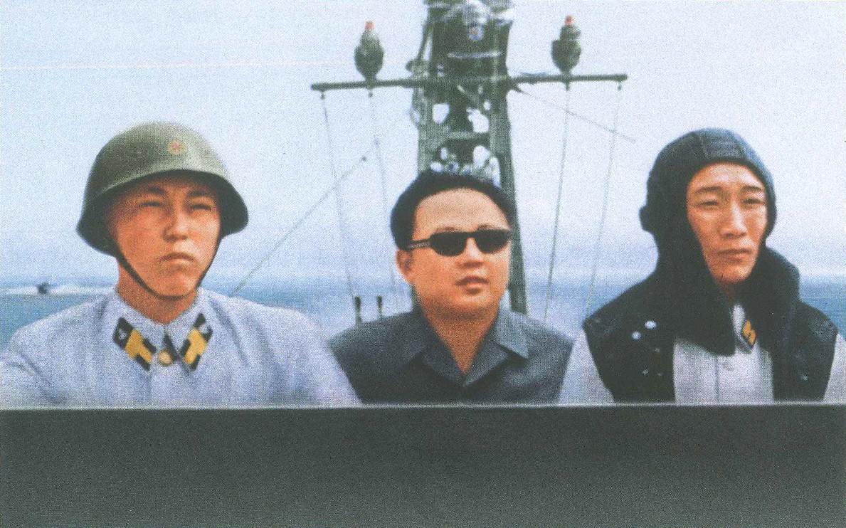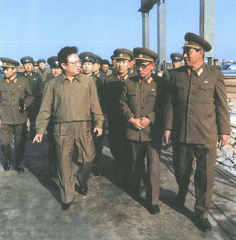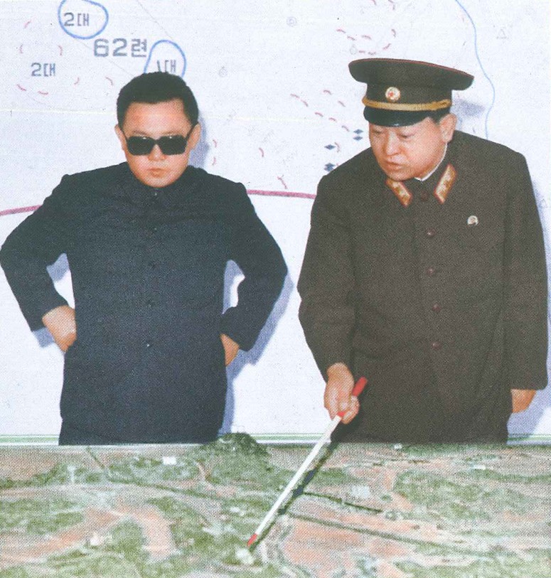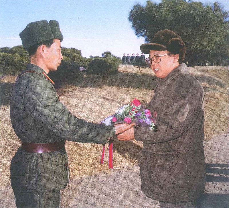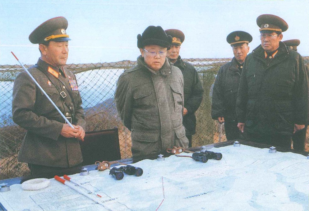 Kim Čong Il počas inšpekcie obrannej jednotky na ostrove Čcho – na prvej línii pri pobreží Kórejského západného mora. Listopad 1996.