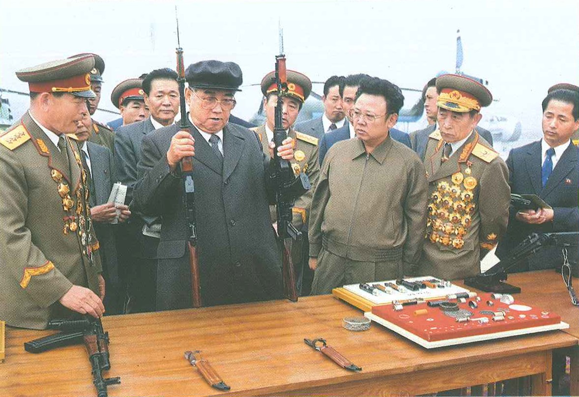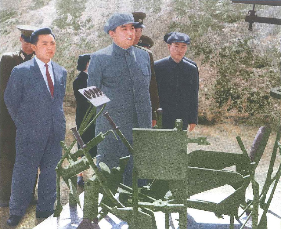 Kim Ir Sen a Kim Čong Il sa oboznamujú s výzbrojou. Duben 1986.
