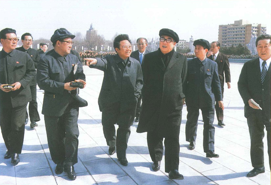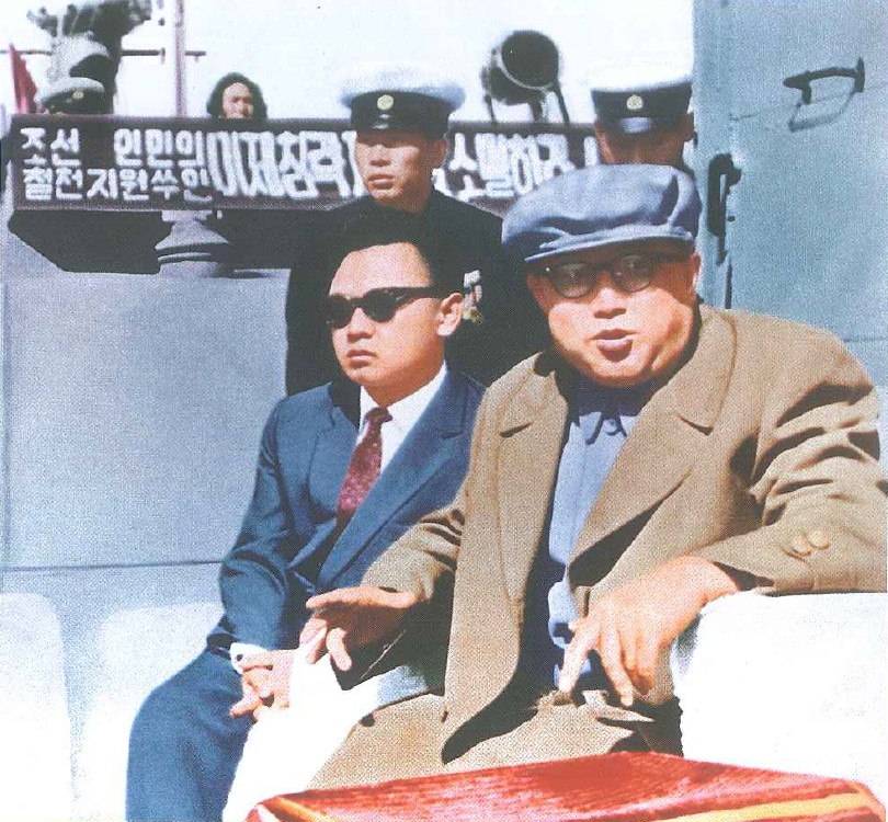 Kim Ir Sen a Kim Čong Il při návštěvě tehdejšího „Korejského filmového studia 8. února“. Říjen 1971.