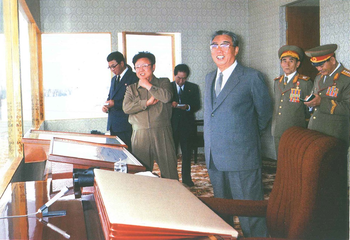 Kim Ir Sen a Kim Čong Il velia vojenskému cvičeniu jedného z praporov KĽA. Duben 1989.