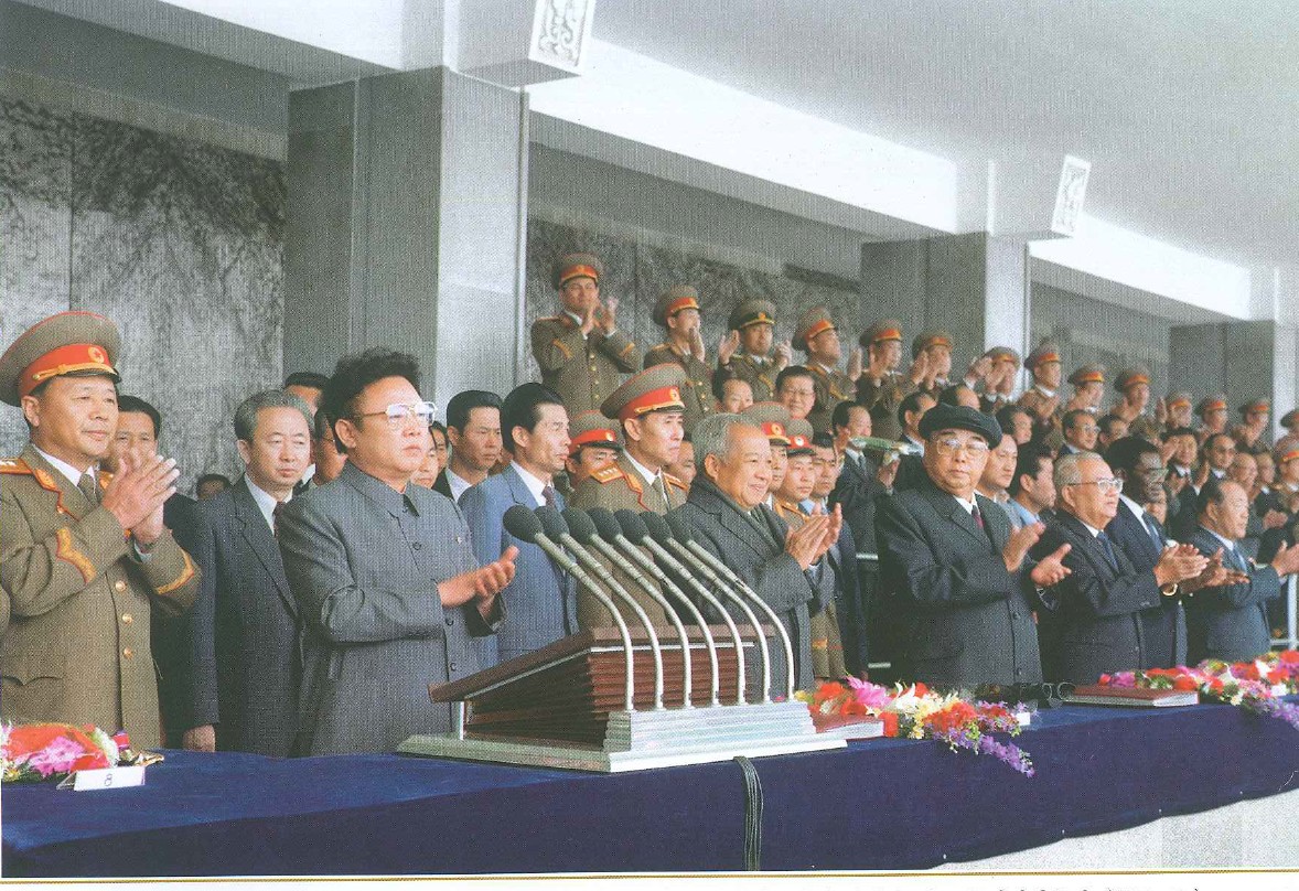 Kim Ir Sen a Kim Čong Il na tribúne vojenskej prehliadky pri príležitosti 60 rokov KĽA. Duben 1992.