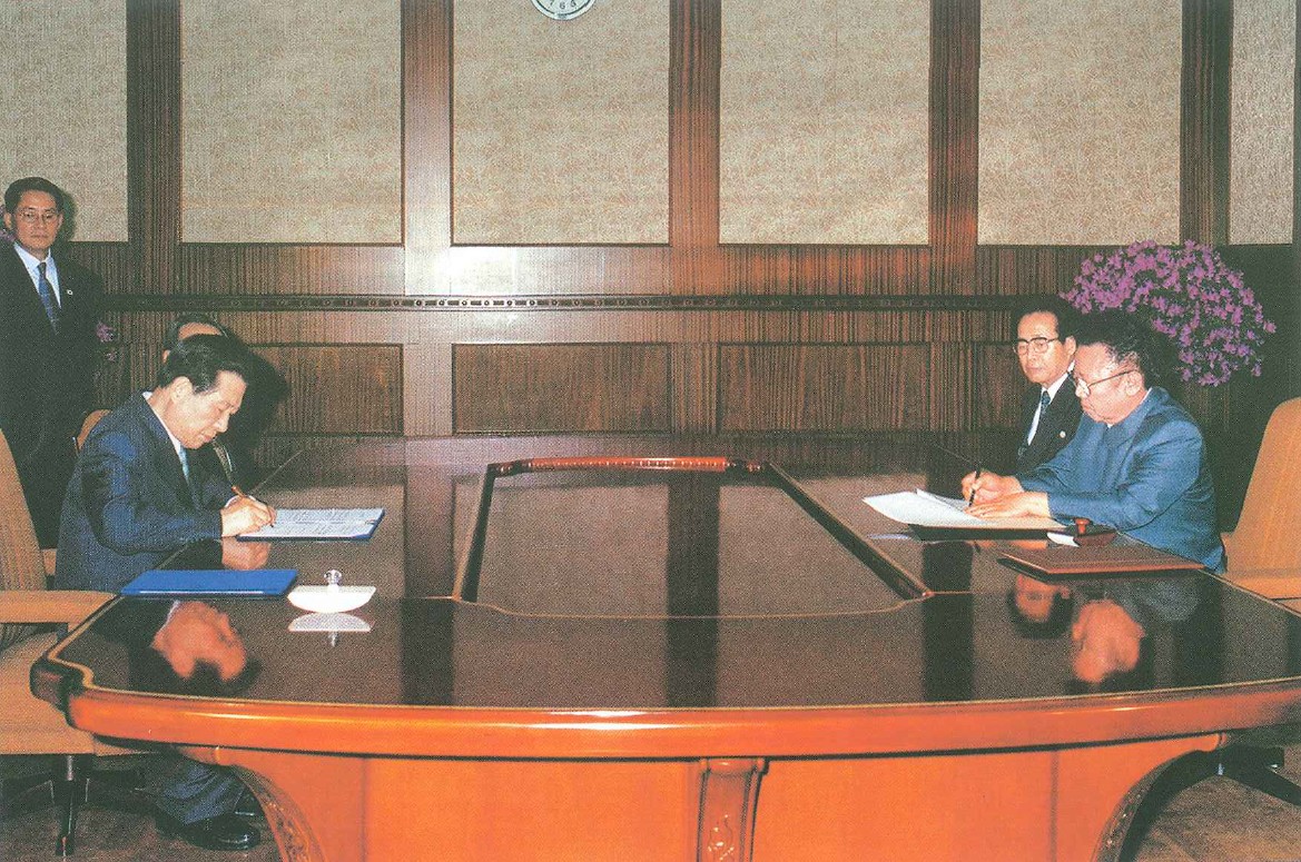 Kim Čong Il podpisuje Spoločnú deklaráciu Severu a Juhu. Červen 2000.